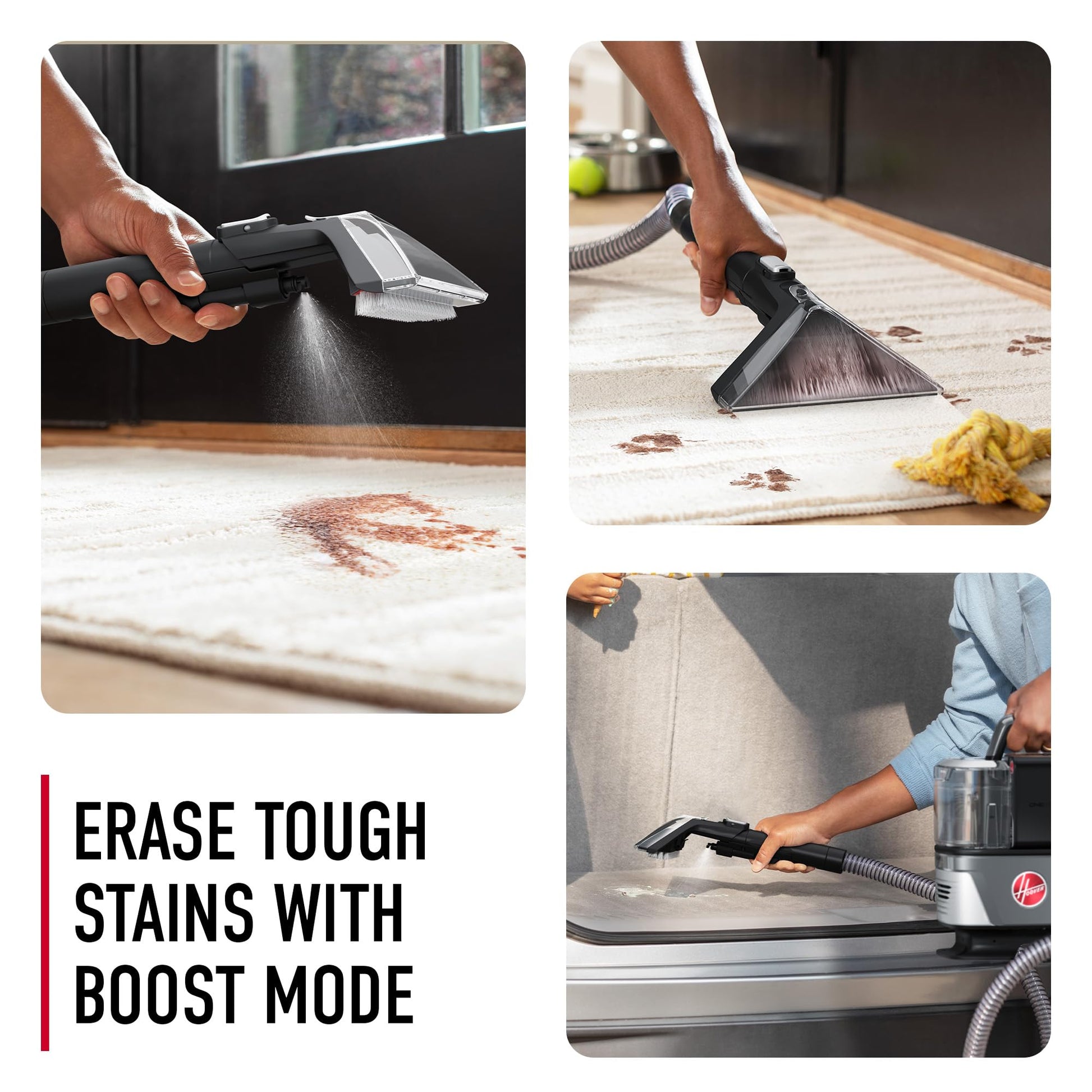 Details: Experience complete freedom with the Hoover ONEPWR CleanSlate cordless spot cleaner powered by the ONEPWR™ battery system. Get whole-home portability with uncompromised power delivering the same deep clean for up to 25 minutes of continuous run time. Boost Mode offers 25% more suction and 20% more liquid recovery with each pass, blasting away tough, colored stains like wine, pasta sauce and coffee on all your carpeted upholstery surfaces in the home and in the car. Accessories include a tight spot tool for hard-to-reach spaces and a 7” WidePath Tool with interchangeable rubber nubs and bristles that scrub away embedded stains, perfect for large areas like cushions and stairs. Our quiet Hushtone™ System includes a brushless motor and creates a serene cleaning experience, keeping ONEPWR CleanSlate quiet without sacrificing power. The easy-empty dirty water tank and built-in hose rinse tool keeps clean-up hassle-free. (1)with Hoover oxy formula (2)when using cleaning boost mode versus normal mode (3)