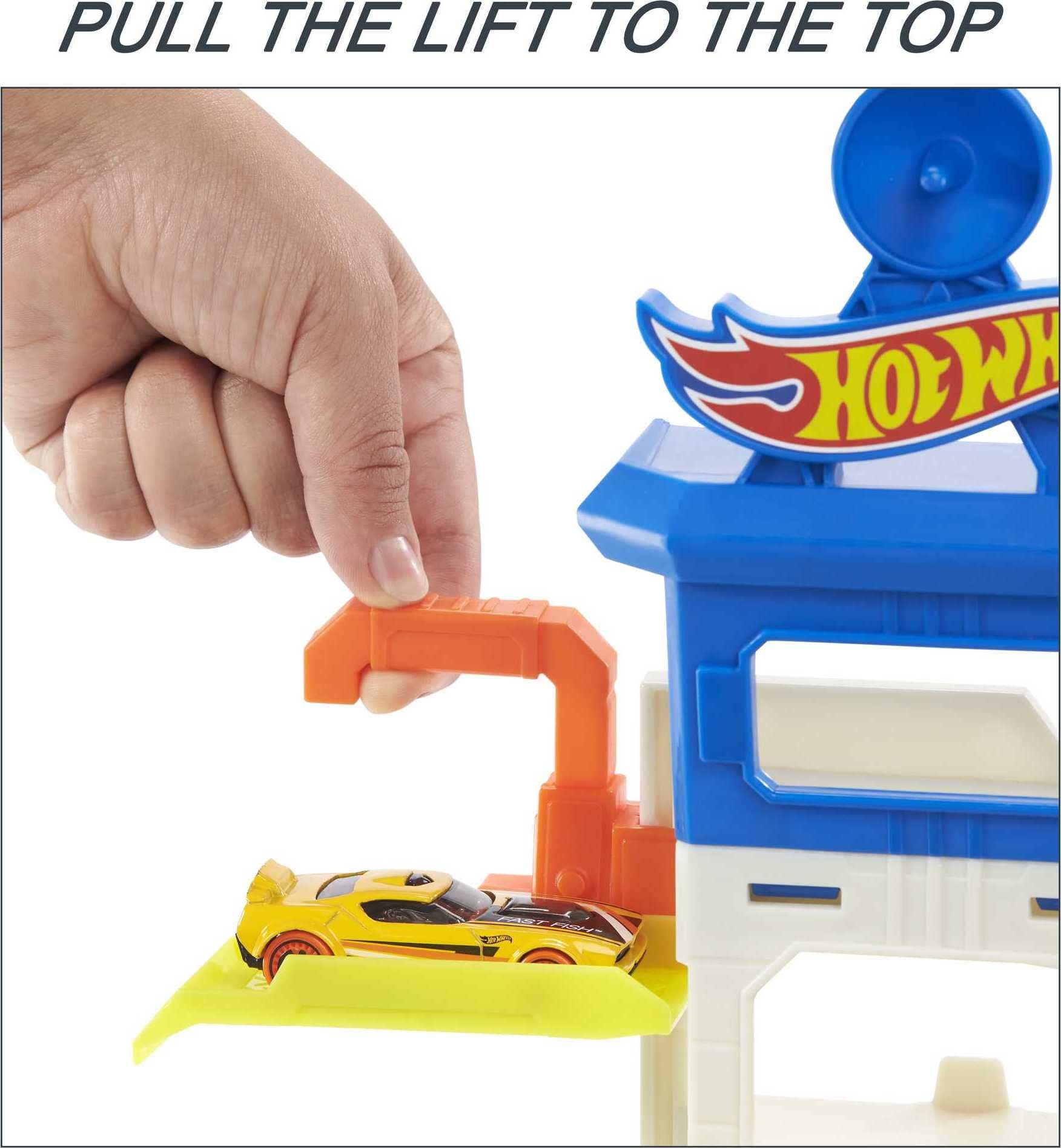 Details: Take a drive through the Hot Wheels City parking garage but beware the dangerous shark that attacks and eats unsuspecting vehicles! Take the kid-powered elevator to the top, then release the car at each level where there are three activators that randomly trigger the shark to break through and devour the car. Escape to the end, and the shark gets locked in the cage, opening the track for attack-free driving. One Hot Wheels vehicle is included, but there's parking for more. (Additional vehicles sold separately.) Connect it to other Hot Wheels sets and track pieces to build a one-of-a-kind cityscape. Colors and decorations may vary.
