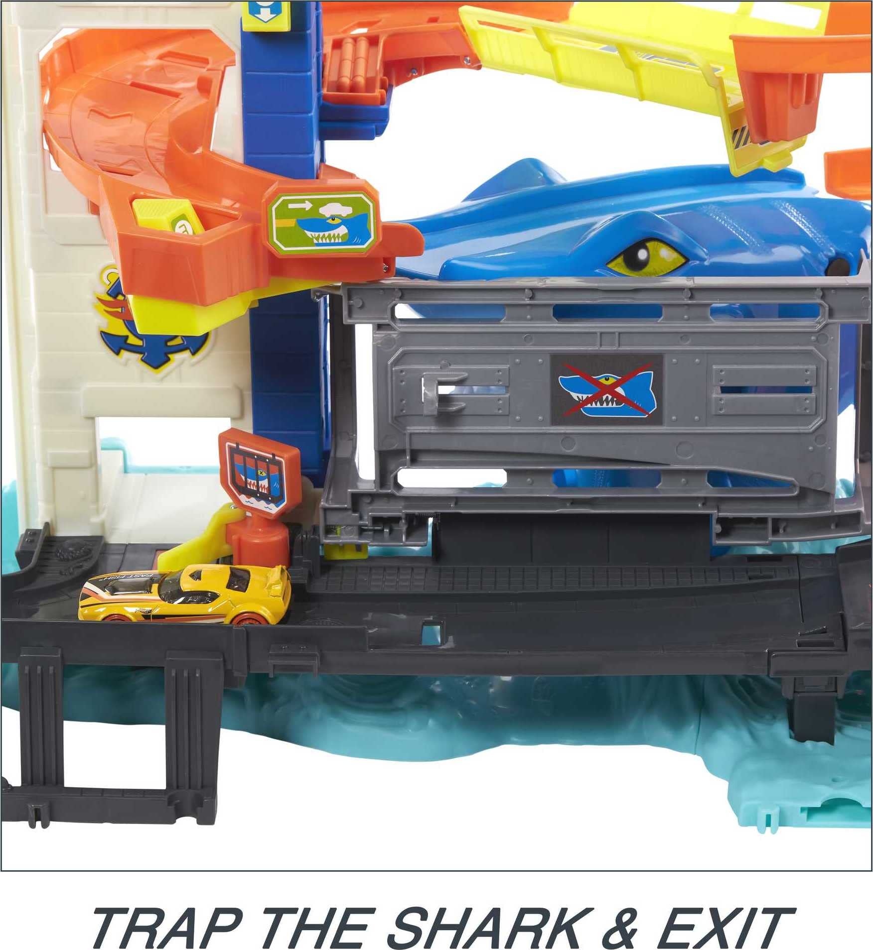 - A massive shark lurks beneath the Hot Wheels City parking garage, attacking and devouring unsuspecting vehicles