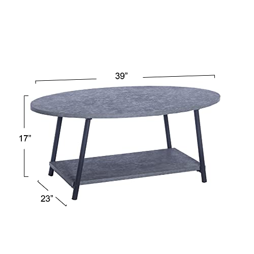 Household Essentials Jamestown Oval Coffee Table with Storage Shelf Rustic Slate Concrete and Black Metal, Grey