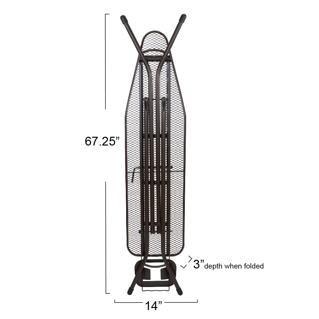 - Ironing board measures 54 inches L x 14 inches W x 34.5-41 inches H when in use; 67.25 inches H x 3 inches D when folded