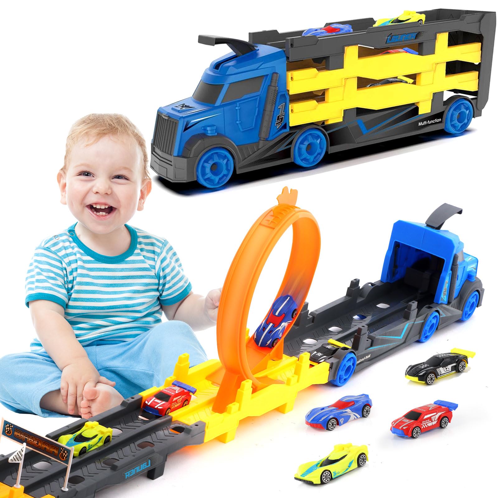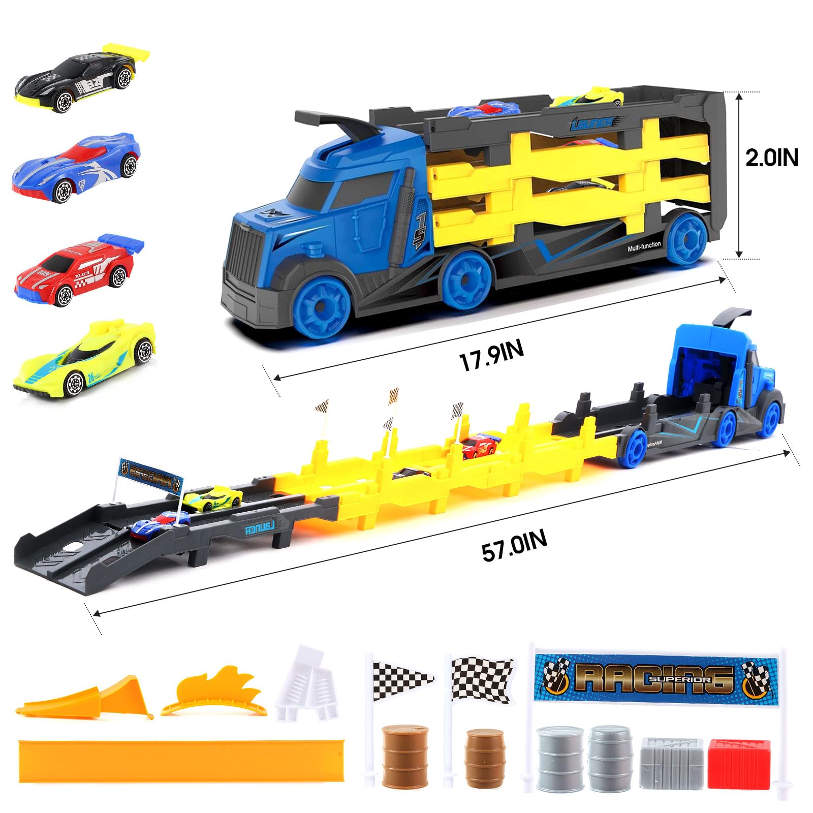 HSEONEJIA Toddler Car Race Track Truck Toy Set, 57 INCH Deformable Mega Hauler Transporter Truck with 4 Small Race Cars, Birthday for Kids Boys Girls Age 2 3 4 5 Years Old