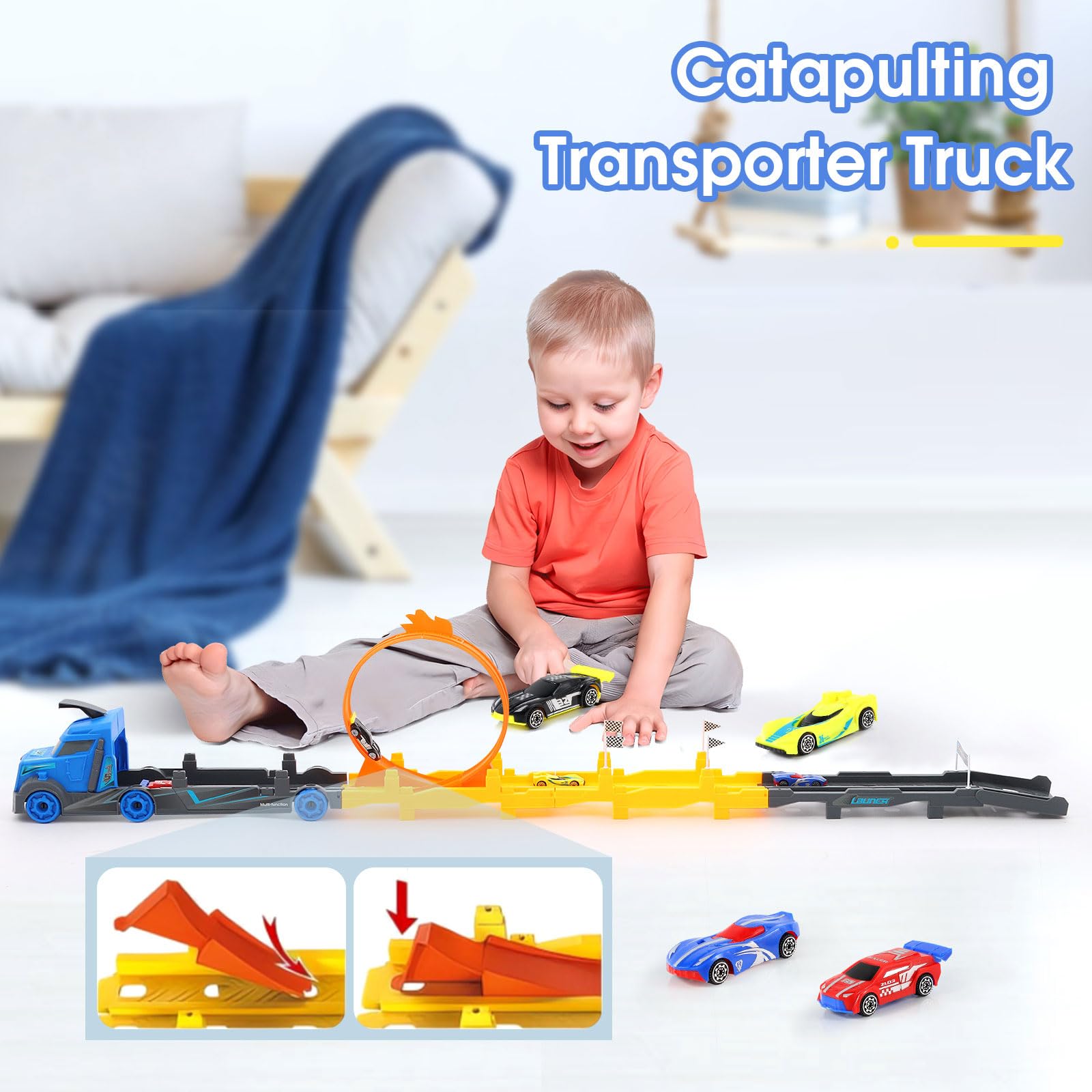 - đď¸ ă57 IN Long Race Track for Endless Fună This truck transforms into a 57 inch long racing track without the need for batteries. Simply press the button on the truck's front to launch two cars quickly. Ideal for toddler race track enthusiasts, this toy provides endless racing excitement for little ones.