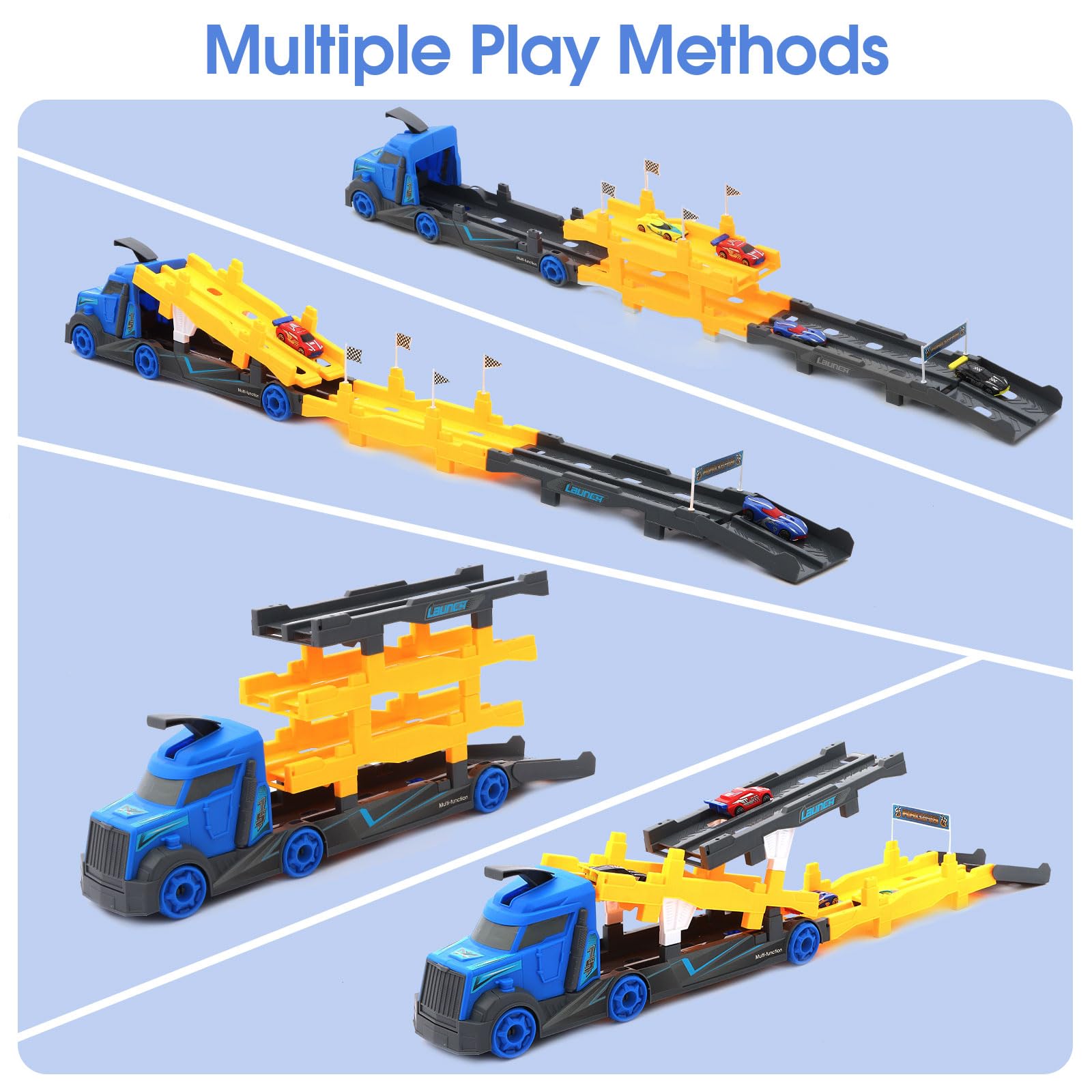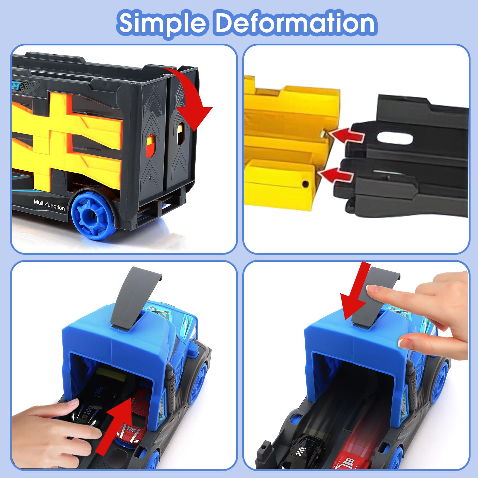 - đ§ ăMultiple Play Modes for Creative Fună This transforming truck can store up to 20 cars and can be easily reassembled into various racing track shapes. The versatile play options enhance children's motor skills and creativity, encouraging them to explore and innovate while having fun.