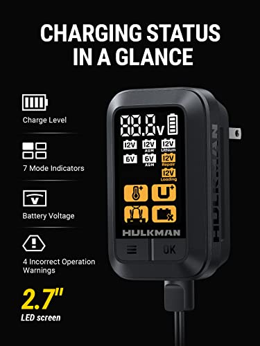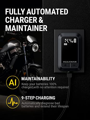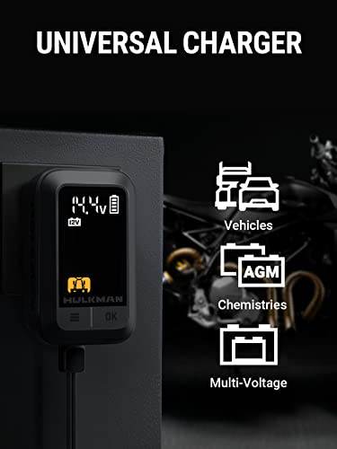 - [Smartest Charger Ever]: HULKMAN's smartest car battery charger yet, the Sigma 1 is built with next-level intelligence. Using its nine-step charging technology, Sigma 1 can now maintain your battery overnight or for an even longer period, with zero attention needed and complete dependability, creating a totally hands-free charging experience.
