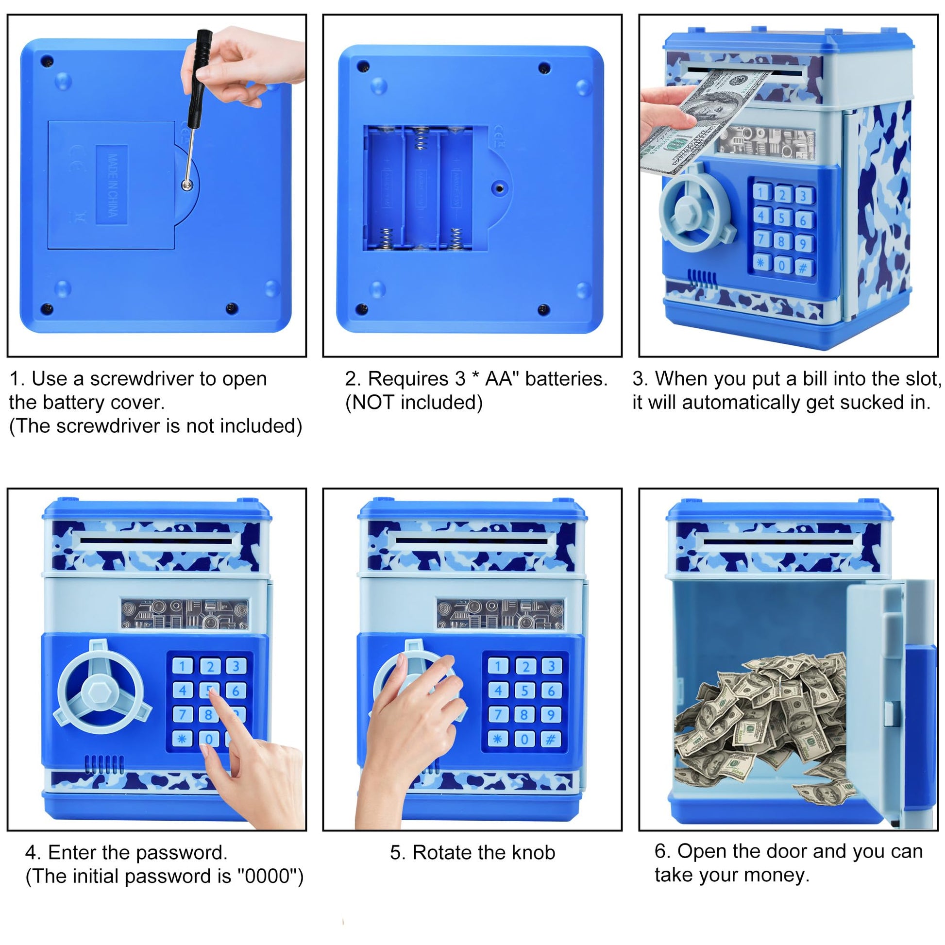 - 🎁📢【The Function of The Piggy Bank】: It is protected with a 4-digit password. The initial password is "0000". You can change it to any 4-digit password. Keep your little secret to yourself, lock them in this safe.