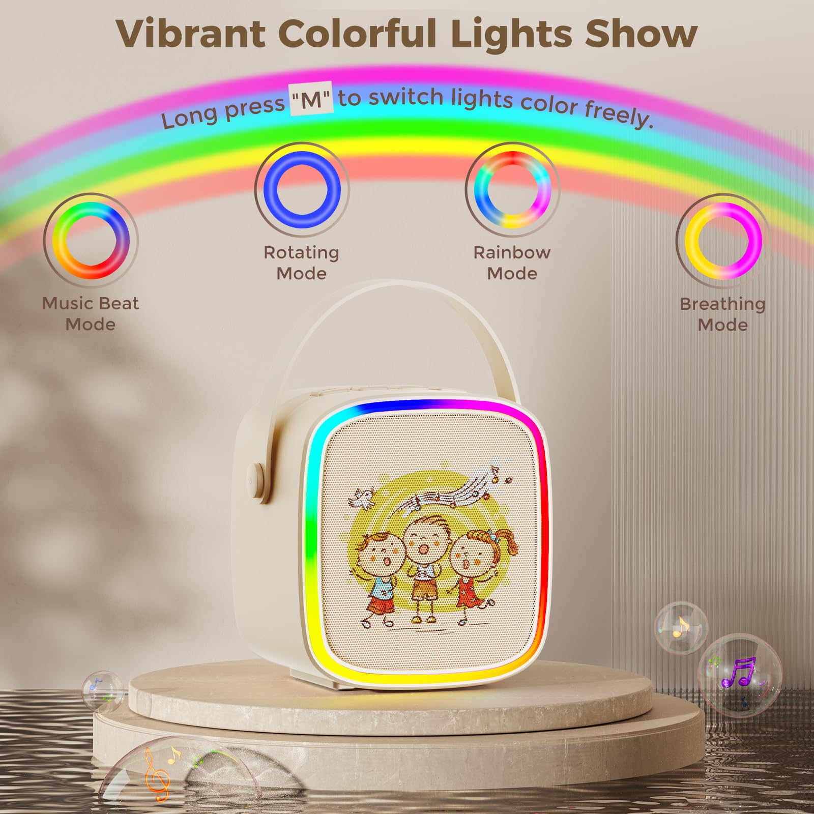 - 【Funny Voice Change & Colorful Lights】5 magic sounds add more funs to your karaoke party! Kids karaoke machine including girl's, boy's, baby's, monster's and the original sound. Sing your heart out with a funny twist! LED lights automatically change with the rhythm of the music, create a lively and festive atmosphere at your party!