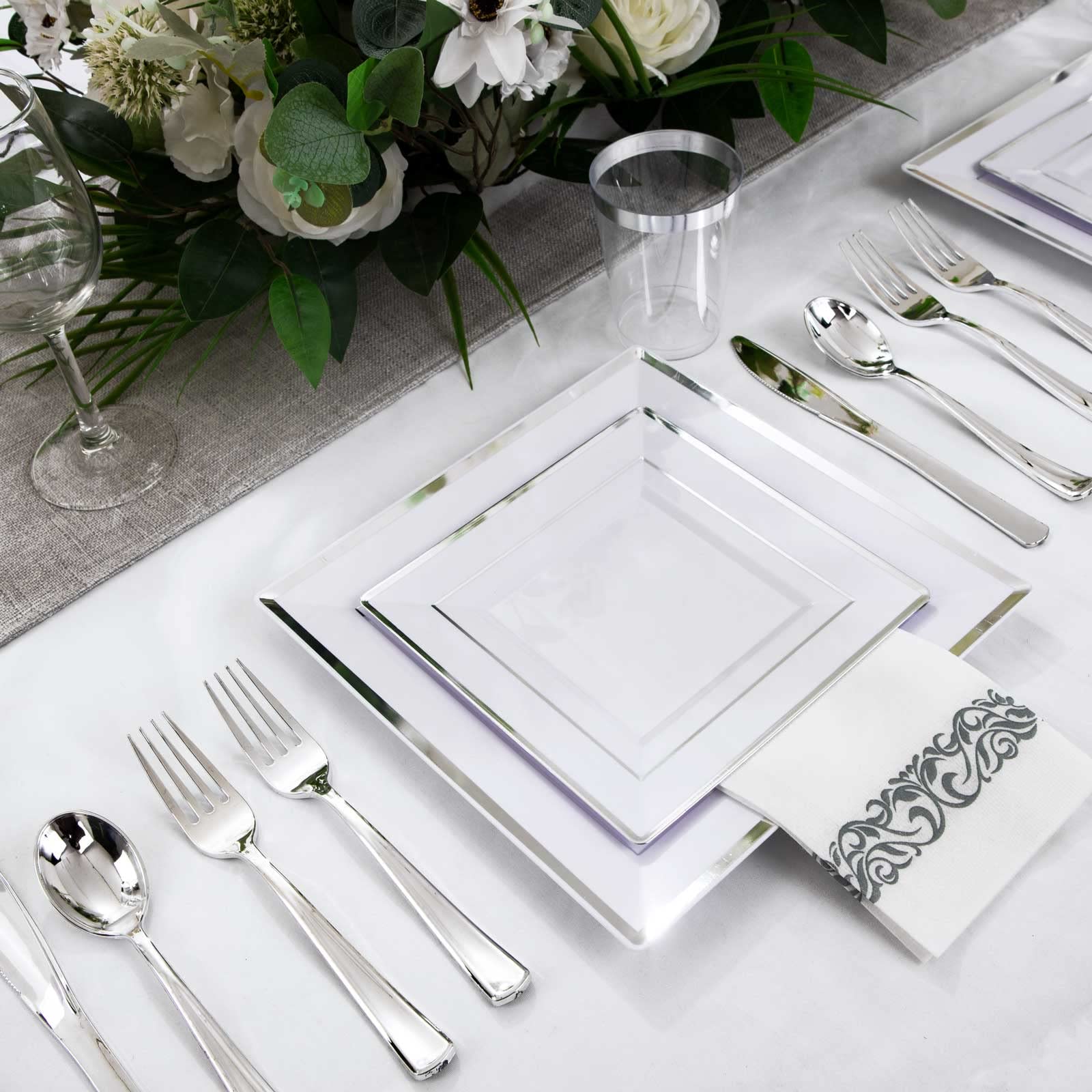 HASSLE FREE CLEANUP: You don't have to worry about washing an enormous pile of dishes at the end of the night. Just toss our square disposable plates and silver disposable silverware in the trash after the party.