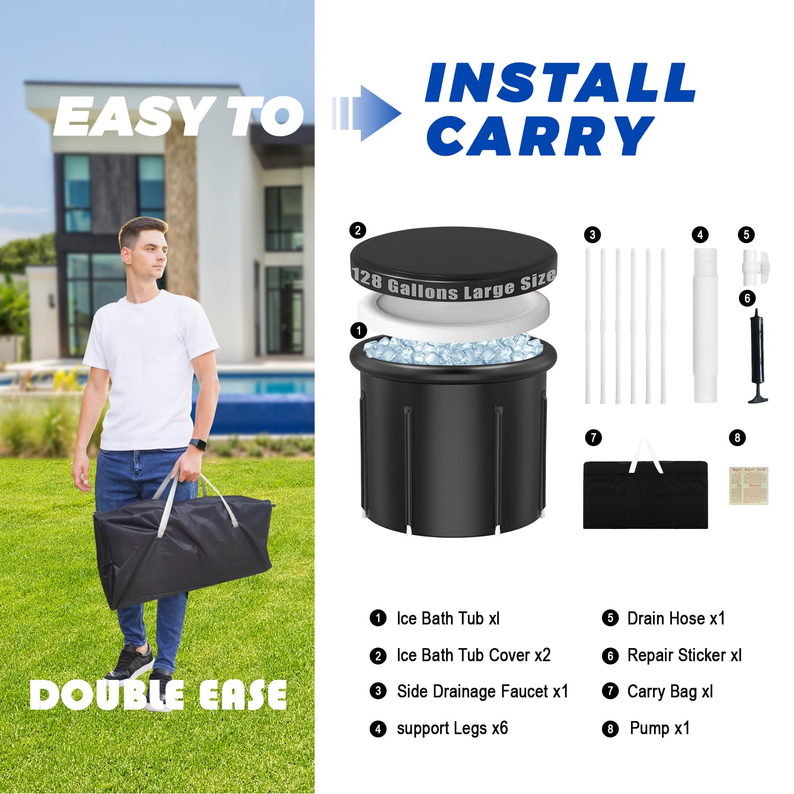 - 【All-Season To Use】: This portable tub for adults comes with a protective cover to shield the water from contaminants and an inflatable thermal cover to maintain the water's cool temperature and cleanliness. Whether it's the sweltering heat of summer or the cold of winter, our ice tubs for cold plunge offers a versatile and efficient solution for year-round enjoyment of the therapeutic benefits of an ice bath.