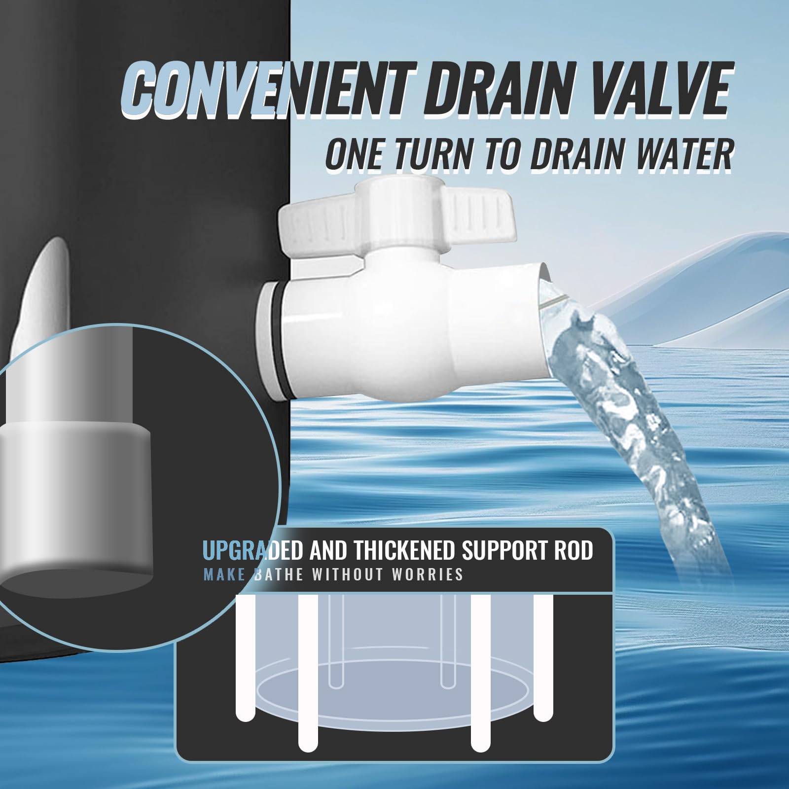 - 【Simple Assembly and Clean】: Assembly is a breeze with all the required parts and clear instructions provided. Set up our cold plunge tub in 5 minutes. For optimal hygiene, we suggest changing the water and cleaning the tub every two weeks. Draining is a simple task with the bottom and side drainage valve, making it easy to empty the tub with minimal effort.