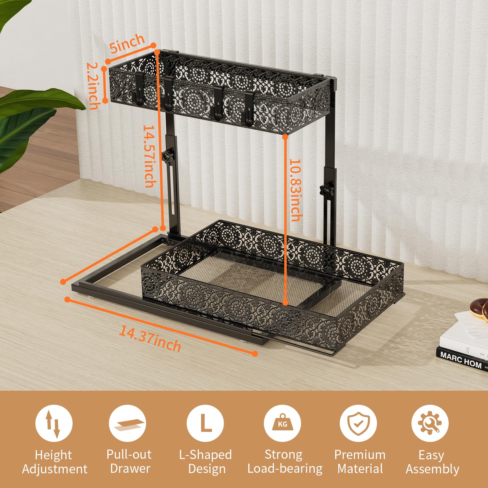 - đŒăSturdy Metal & Unique Floral Patternă- This under sink storage is made of strong and durable metal for high load-bearing capacity and durability. The support tube is uniquely reinforced and thickened for excellent rust resistance. 4 suction cups on the bottom can make the slide out sink shelf more stable. The unique metal floral pattern turns the sliding under cabinet organizer into an artwork, giving it a visual beauty that adds elegance and sophistication to your home.