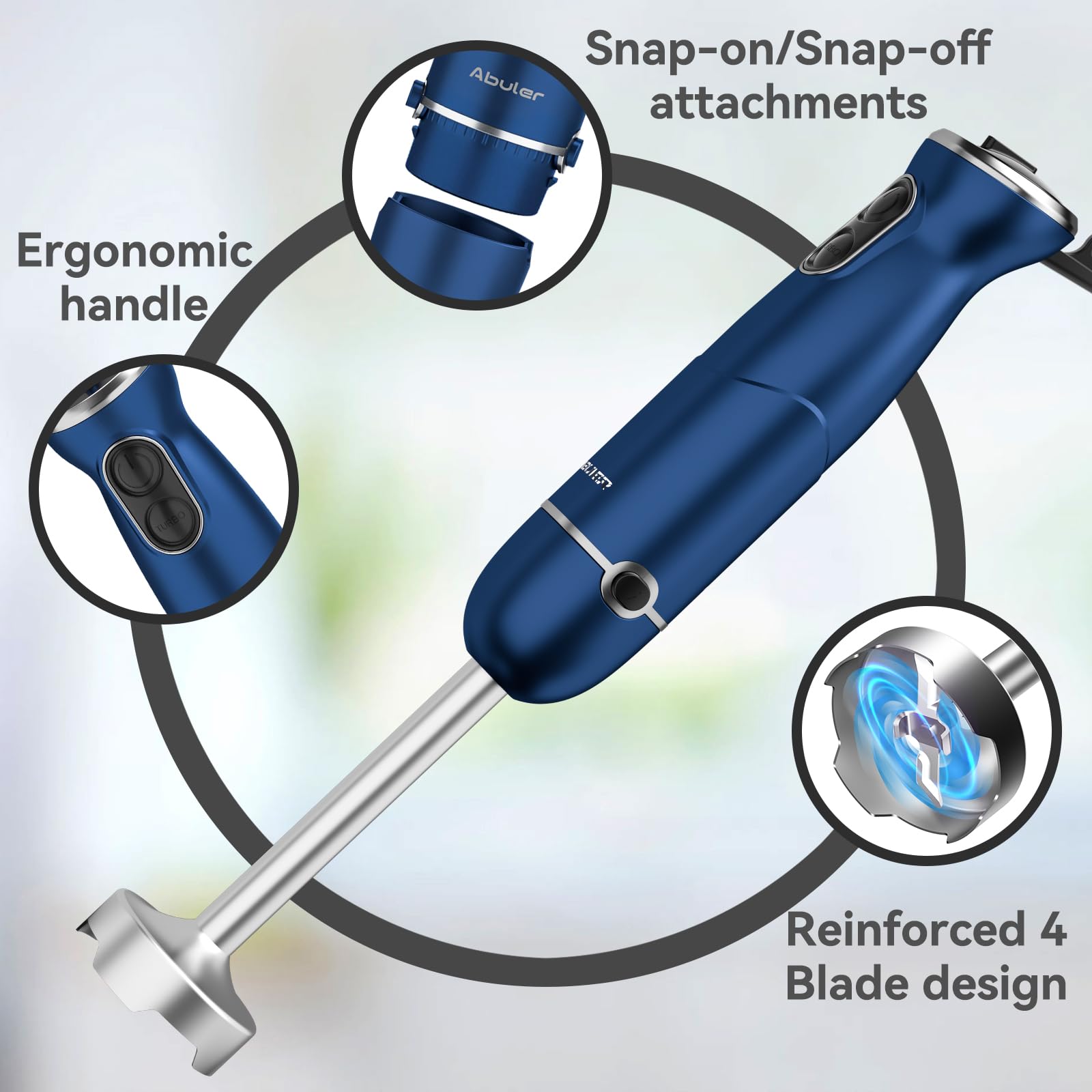 - POWERFUL IMMERSION BLENDER HANDHELD: Abuler handheld blender (batidora de mano electrica) features a powerful awesome 1000-watt blending power and turbo boost mode, which would be a time saver when making soups, sauces, homemade salad dressings for meal prep or making smoothies and milkshakes with healthy natural raw ingredients.