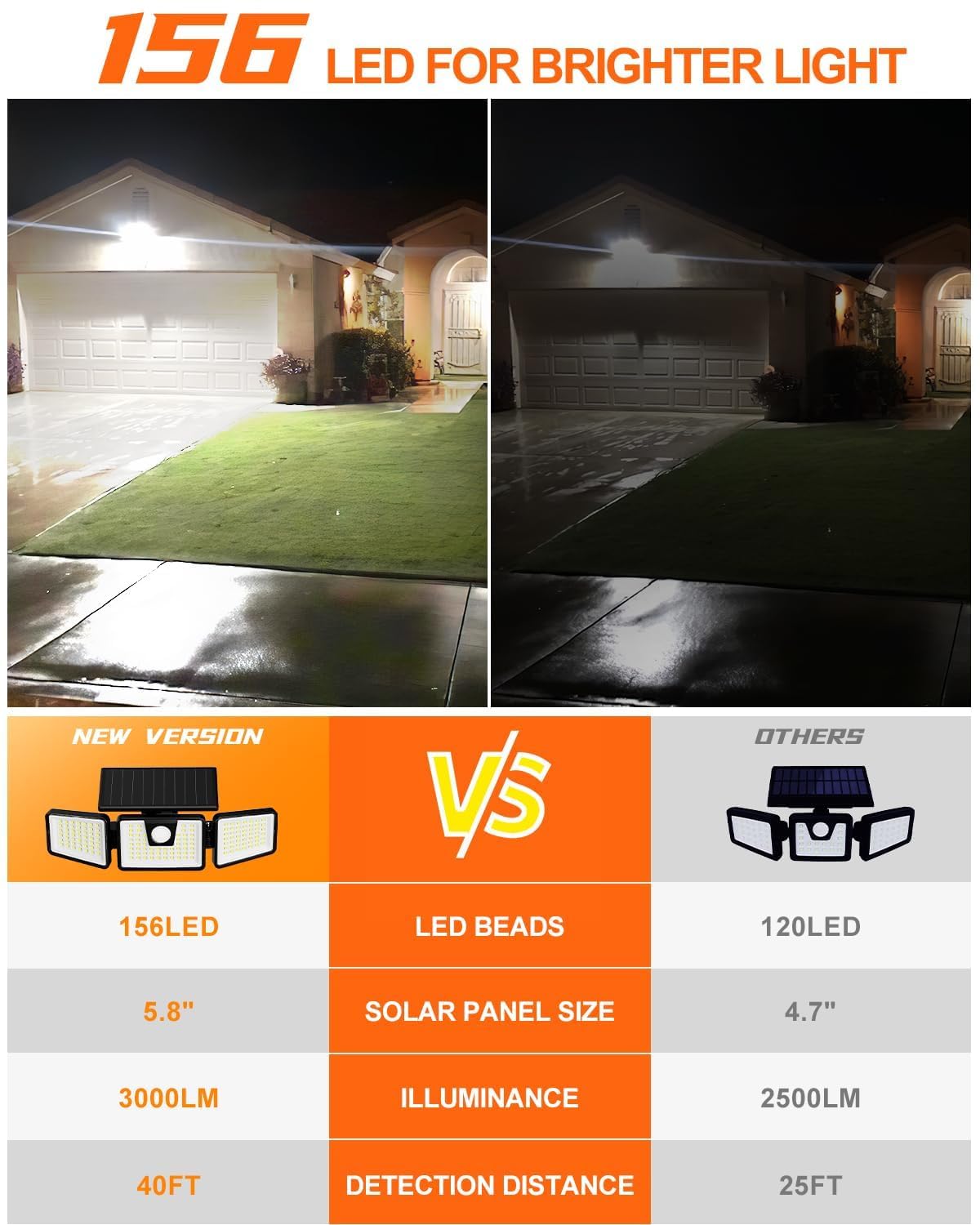 - 【SPECIFICATIONS】:Solar Panel: 1.8W, 5.5V; Wattage: 8W; LED qty: 156 pcs ; Waterproof Rate: IP65; Installation Type: Wall Mounted; Sensor Angle:120 Degree; Color Temperature: 6500K; Modes: Off / Sensor.