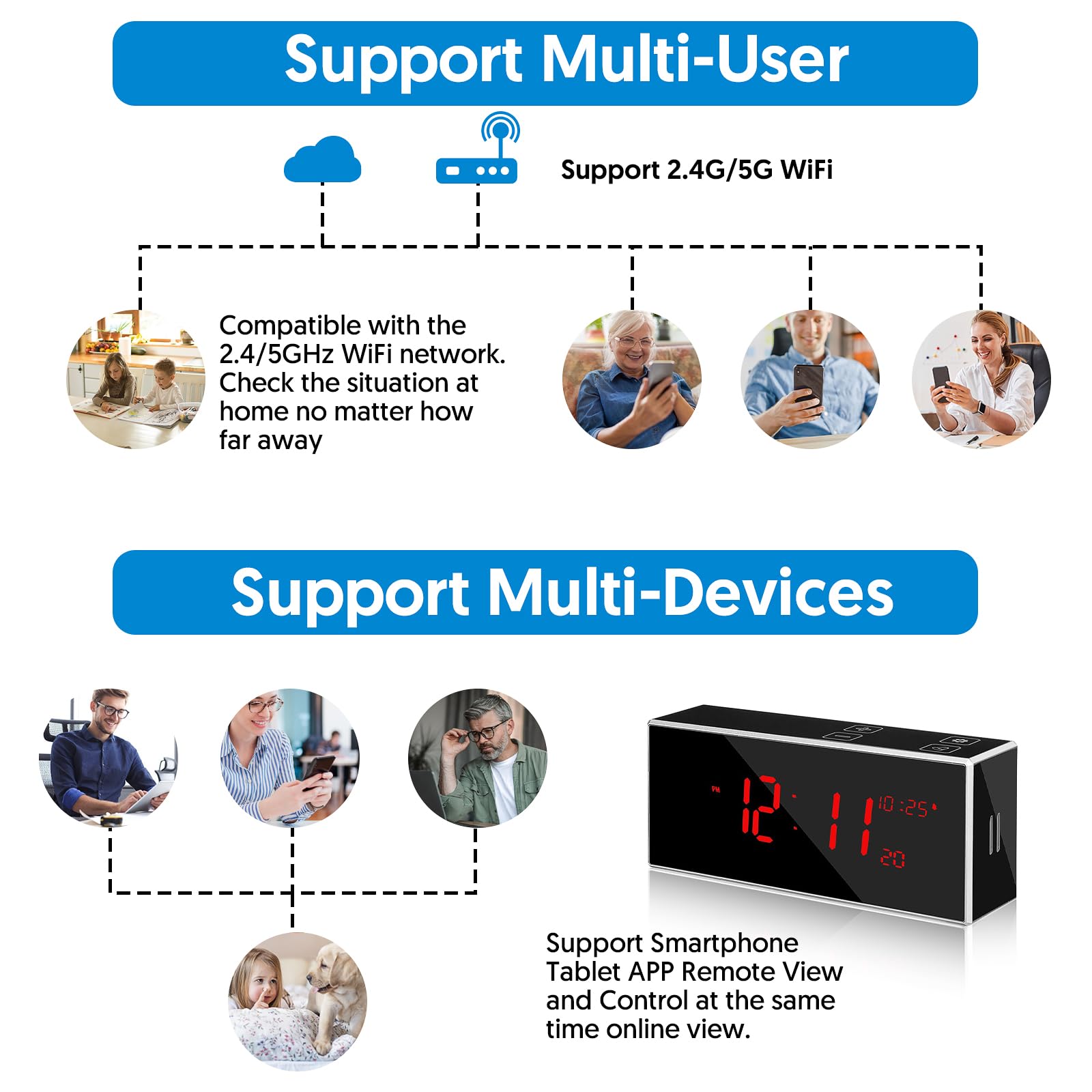 - Support 2.4/5Ghz Dual-band Network :Our camera supports both 2.4Ghz and 5Ghz dual-band networks, ensuring a stable and fast connection. You can enjoy smooth and uninterrupted monitoring, whether you're viewing live feeds or reviewing recorded footage.