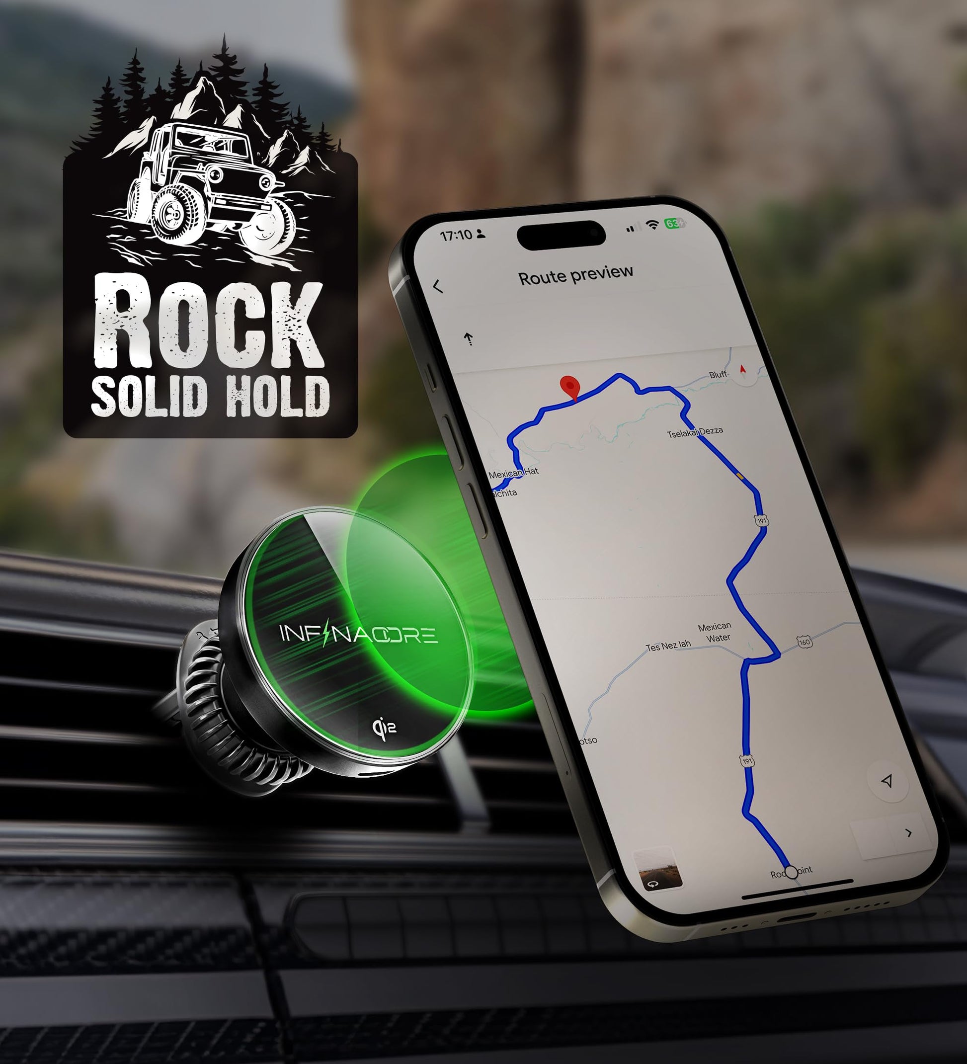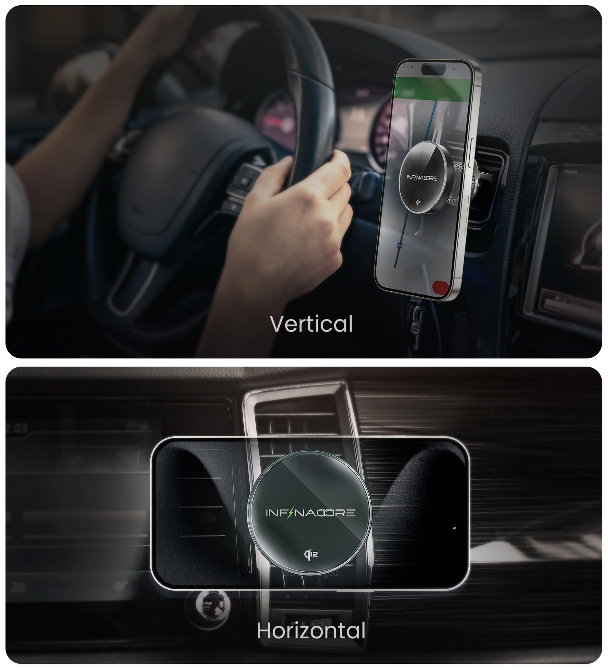 - InfinaCore for Wide Compatibility with MagSafe: Car mount charger designed for MagSafe-enabled Apple iPhone 16/15/14/13/12 Pro/Max/Plus/Mini, magnetic/MagSafe cases, Samsung phones, and other Qi2-certified devices, ensures wireless charging for a wide range of devices.