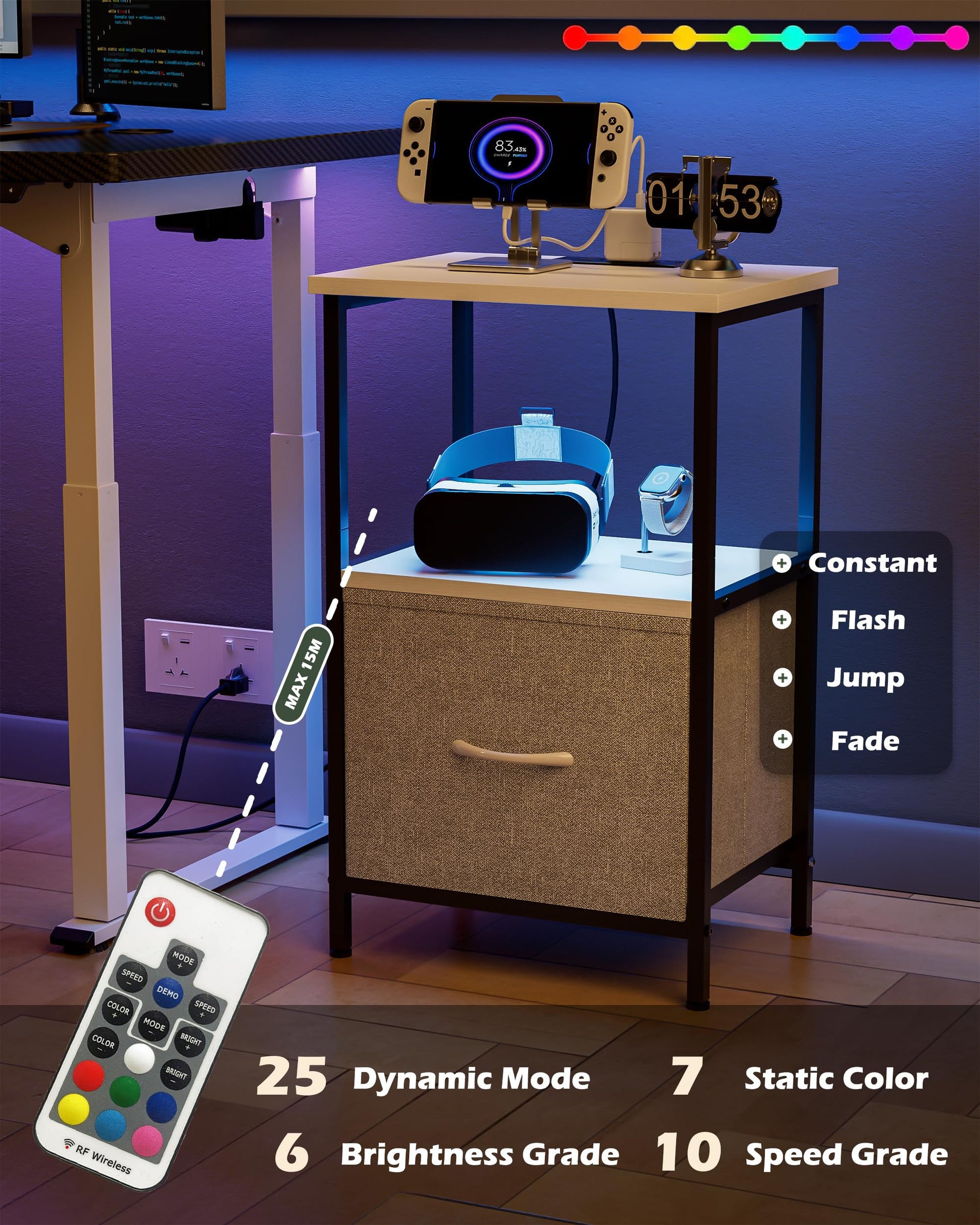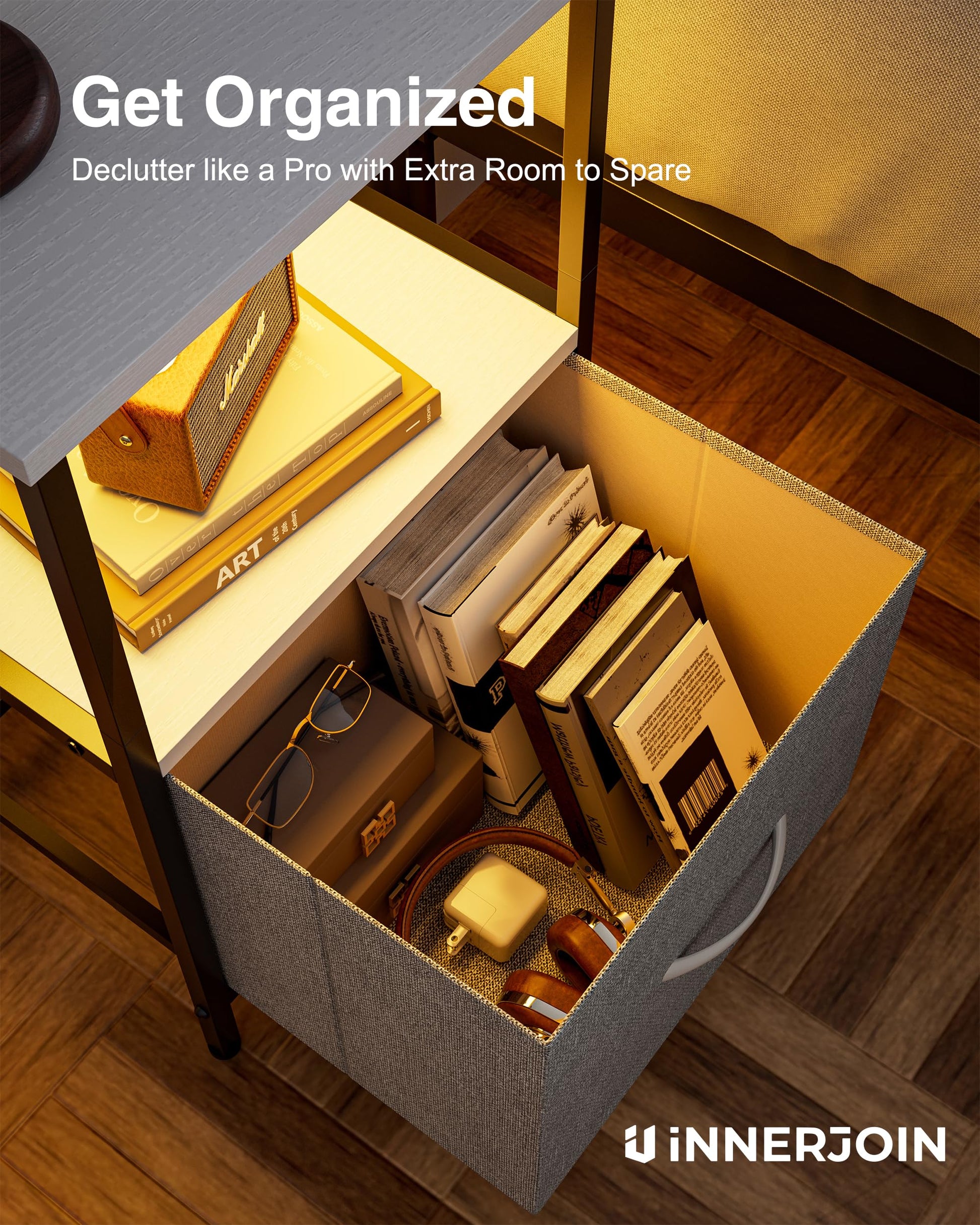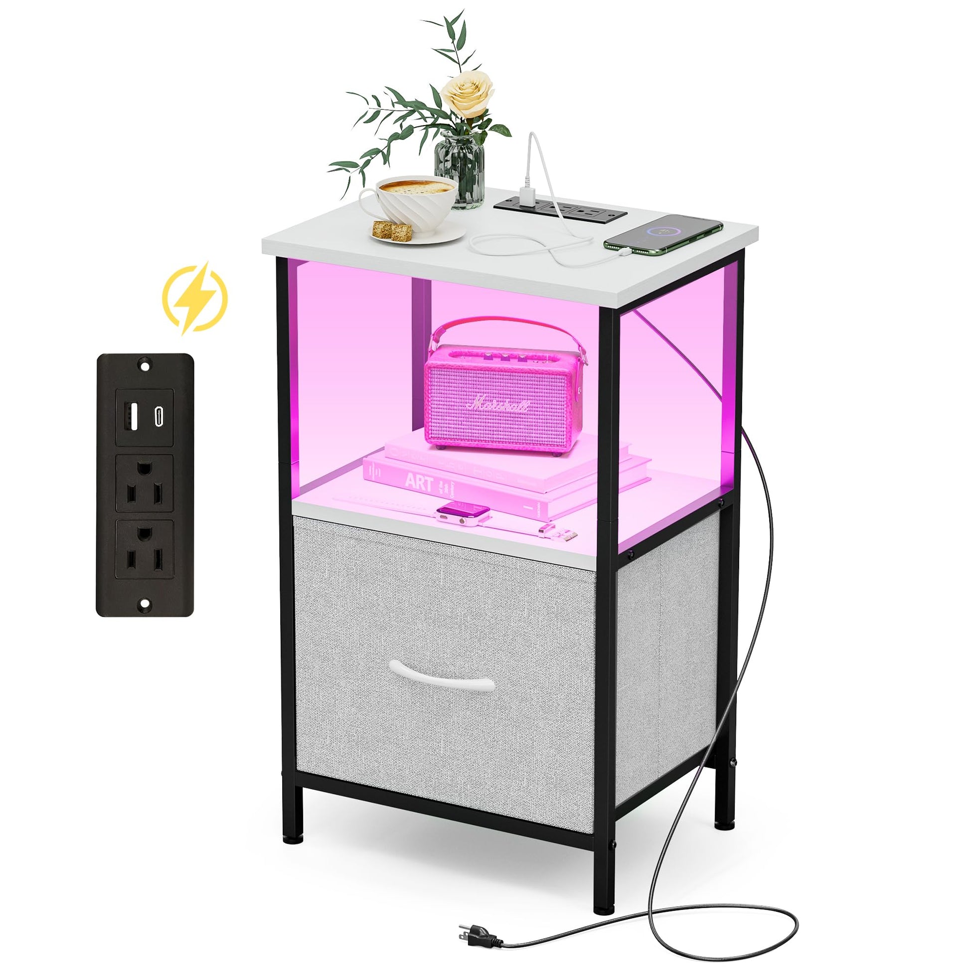 Innerjoin Side Table with Storage, LED Night Stand with A&C Charging Station, End Tables Living Room, Nightstand for Bedroom with Fabric Drawer, White/Gray