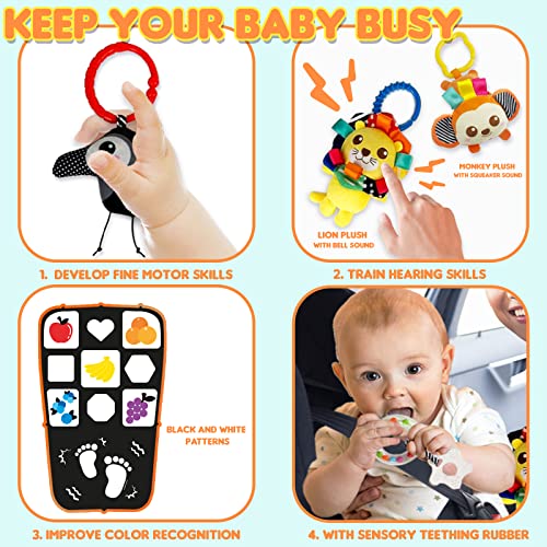 - đźš—FINE MOTOR SKILS - Comes with soft Teether, Beads with ring, lion plush with bell, monkey plush with squeaker sound, bird plush with black and white color. They are lovely hanging animal toys which will make interesting sounds to keep the baby busy.