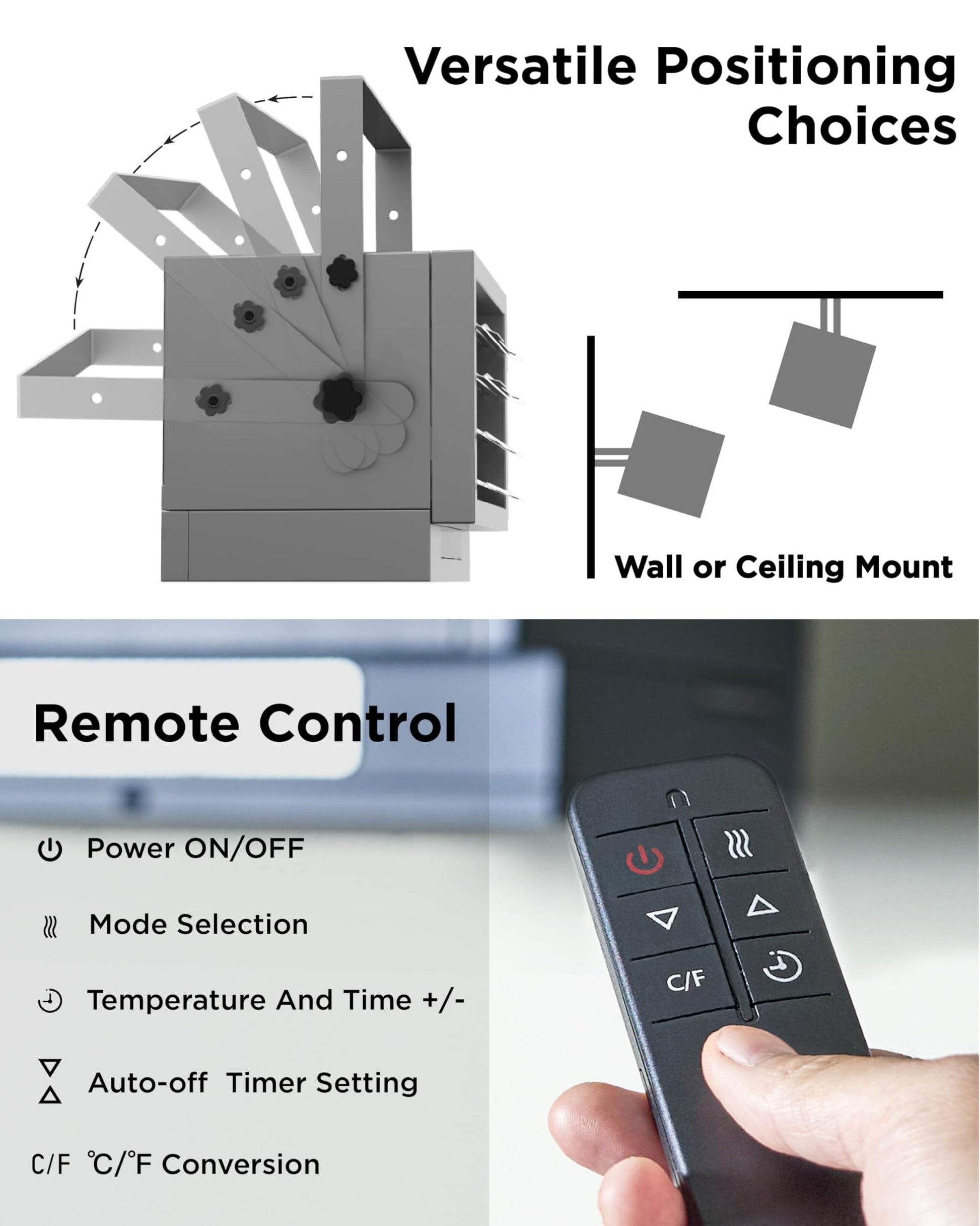 - Providing five angle adjustments during installation, allowing you to accurately direct warmth where needed. The flexible louvers can be adjusted to ensure even heating throughout the garage, creating a comfortable environment. Designed for wall or ceiling mounting and hard-wired installation, it offers a convenient solution to maximize floor space in busy areas.