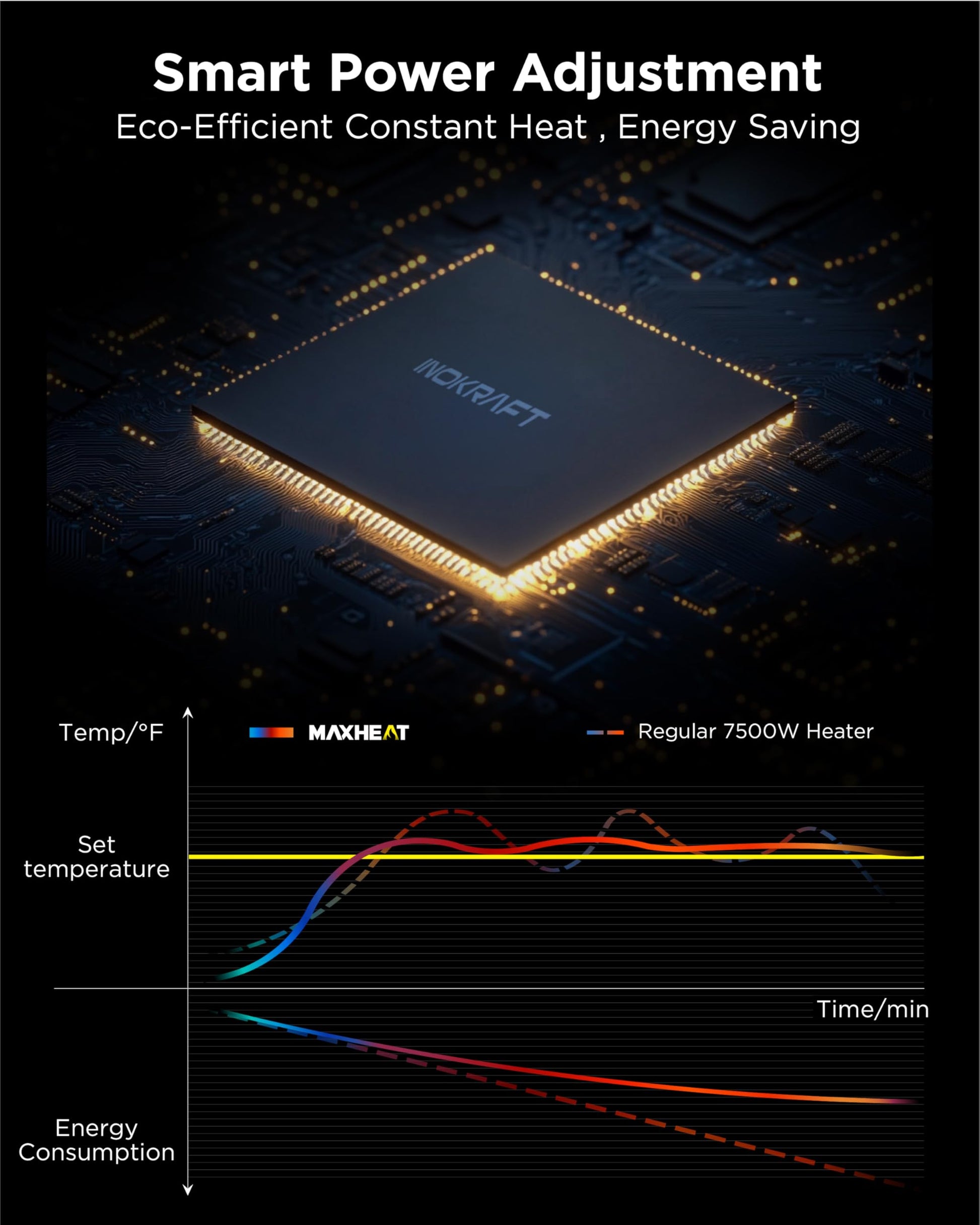 - Immerse yourself in cozy comfort with InoKraft Max Heat powerful 240V 7,500 watt fan-forced wall heater, perfect for heating up large spaces quickly. It can raise the temperature by 90℉ in a 750ft² room. Operating quietly at 60 dB, it ensures a peaceful environment. With 2 heat settings (Standard Power/Eco Mode), this heater guarantees optimal warmth for your space. Ideal for garages and workshop, this heater is a must-have for chilly days.
