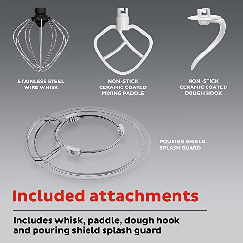- INCLUDED ATTACHMENTS: It comes with (1) 6.3-qt stainless steel mixing bowl that can mix large batches of dough, (1) mixing paddle, (1) dough hook, (1) whisk, and a removable pouring shield.