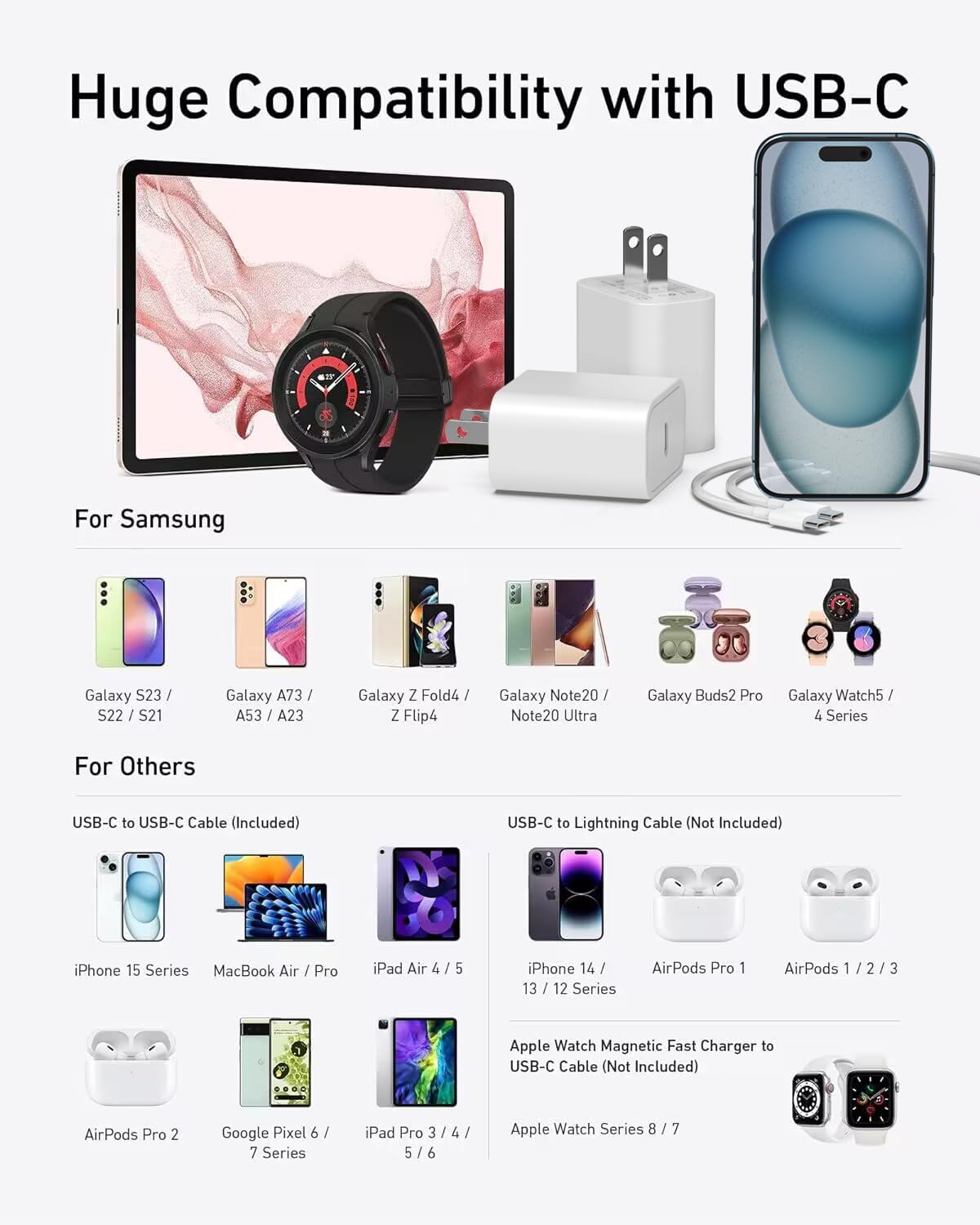 Compatible with a wide range of devices, including the latest iPhone 16, iPhone 15, iPad Pro, Samsung Galaxy, and more, this charging kit is a versatile solution for all your USB-C devices.