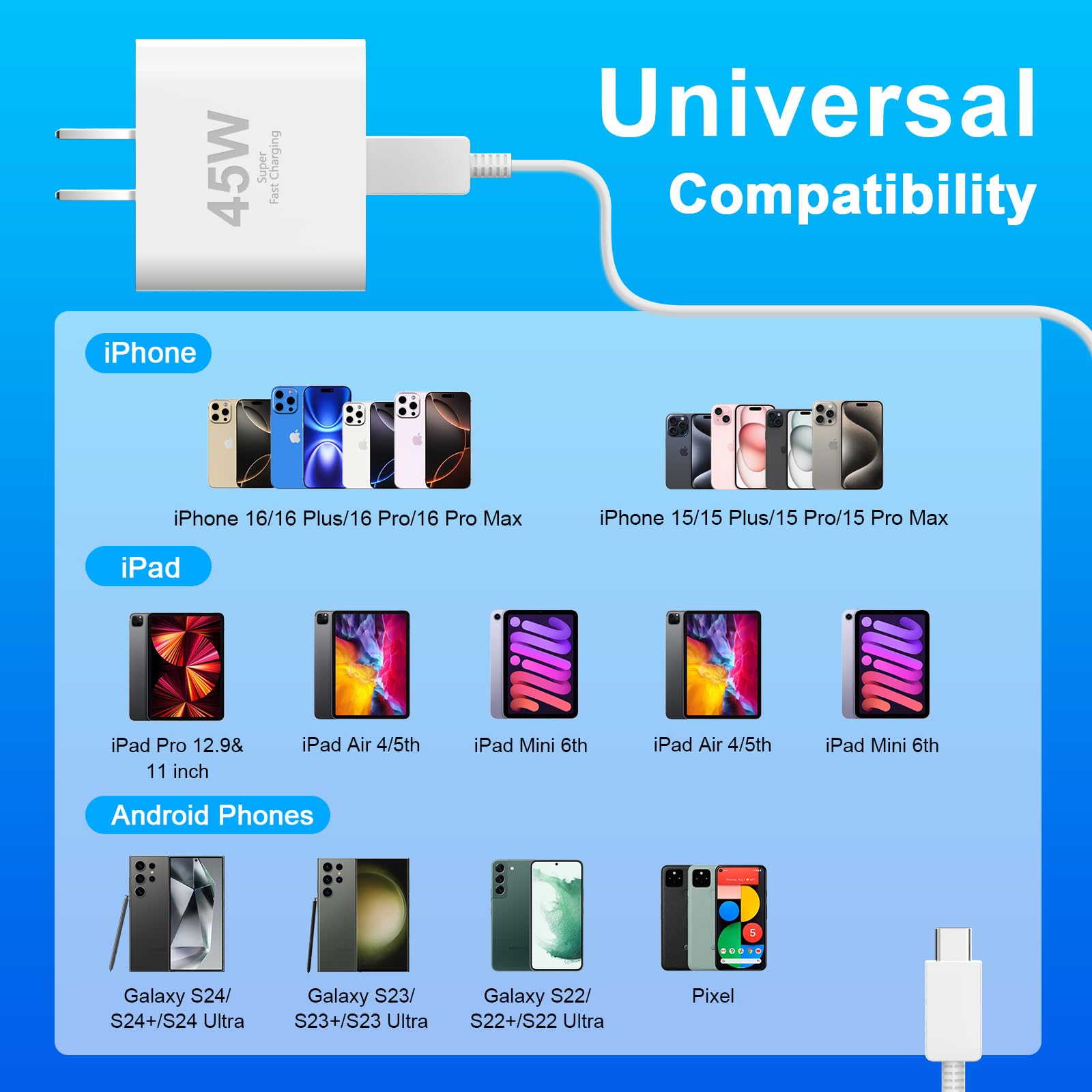 - 【Universal Compatibility】 Extra Long 10 ft iPhone 16 chargers are perfectly compatible for iPhone 16/16 Plus/16 Pro/16 Pro Max/15/15 Plus/15 Pro/15 Pro Max, iPad 12.9/11 inch, iPad Mini 6th, iPad Air 4/5th, iPad 10th, MacBook Air/Pro. This 45W iPhone 16 charger also super fast charging for Galaxy S24/S24+/S24 Ultra/S23/S23+/S23 Ultra/S22/S21/S20/S10, Pixel 8/7/6/5/4/3/2 XL, and more usb c devices.