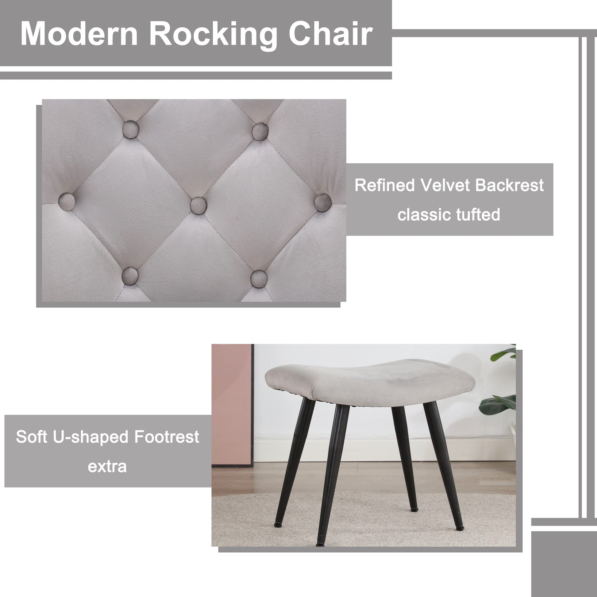 - 【Sturdy And Stable】Nursery rocking chairs is made of metal frame, with solid wood rocker. This makes nursery glider indestructible and gives you excellent support. The nursery chair can bear a maximum weight of 330 pounds. The nursing chair also has two felt pads and 360-degree adjustable foot caps on the pedals, can reduce scratches and sliding, but more importantly, can ensure the velvet chair's stability. The modern comfy chair is suitable for all spaces, and can be used many years!