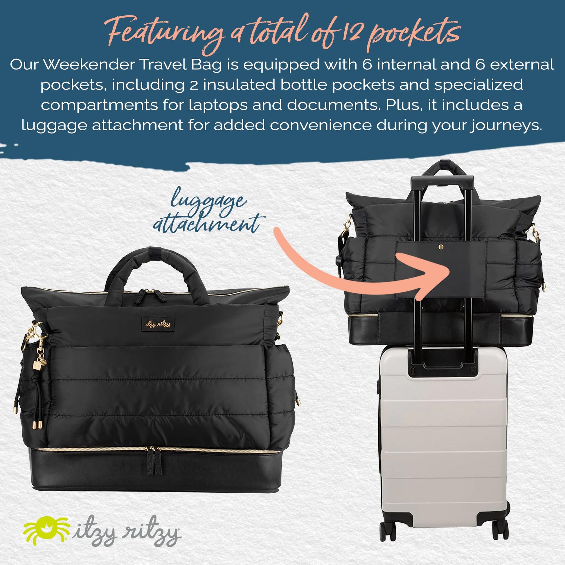 Prepare to be impressed by the Itzy Ritzy Dream Weekender Bag - the ultimate bag for new moms and travelers alike! This versatile bag is designed to meet all your needs, serving as a hospital bag, an overnight tote, and an extra-large diaper bag all in one. With spacious compartments, you can comfortably store your new mama essentials, laptop, and hospital paperwork. And when you're not on a hospital visit, it effortlessly transforms into a stylish overnight bag or a super-sized travel diaper bag. One of the standout features of the Dream Weekender is its 12 total pockets, providing ample storage space for all your items. The bag includes designated pockets for hospital paperwork and a laptop, making it ideal for those looking for a labor hospital bag. The separate zippered base compartment, complete with an Itzy Ritzy branded rubber base, ensures stability and keeps the bottom clean. Designed for your comfort, it comes with an adjustable shoulder strap for parents of all heights. Additionally, the convenient luggage attachment allows you to effortlessly attach it to your luggage handle when you're on the move. With a size of 20" L x 8.3" W x 18" H and its lightweight puffer-style material, the Dream Weekender is ready to accompany you on your next adventure, ensuring you're always well-prepared and stylishly organized. Experience Itzy Ritzy's Dream Weekender bag - Spacious, Versatile, Chic!