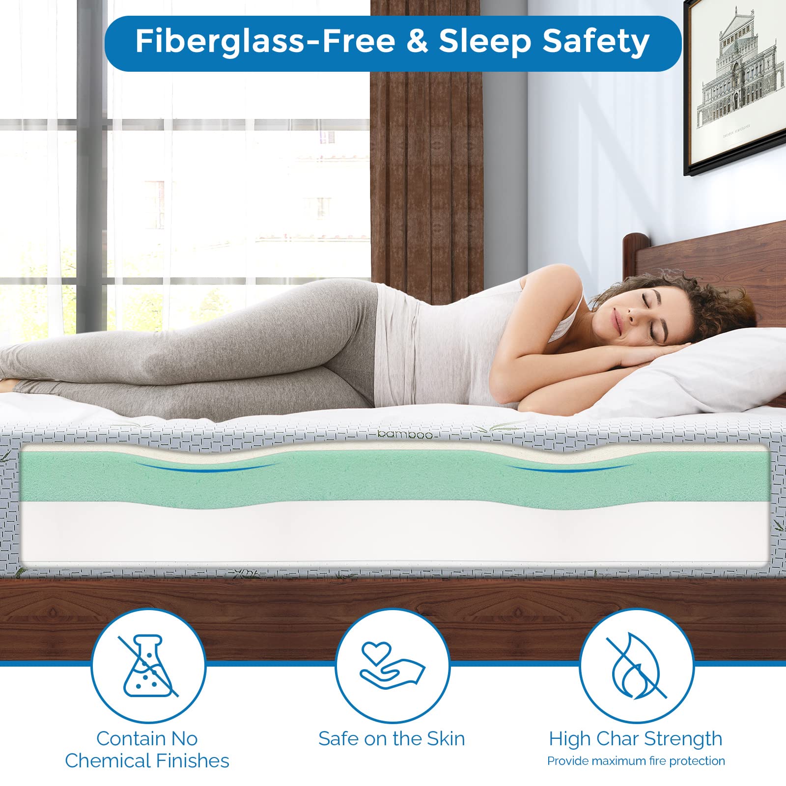- Fiberglass-Free: The bed mattress is surrounded by a fiberglass-free inner cover, creating an effective flame retardant layer. The removable outer cover is made of natural bamboo fiber, which is naturally skin-friendly, breathable, soft, and can effectively decompose and absorb sweat. The evenly distributed anti-slip particle design at the bottom effectively prevents the foam mattress from shifting.