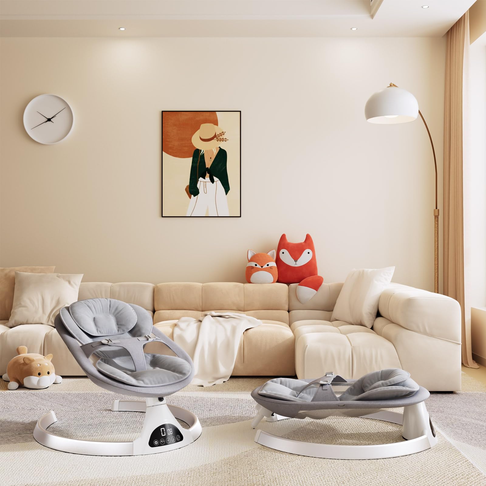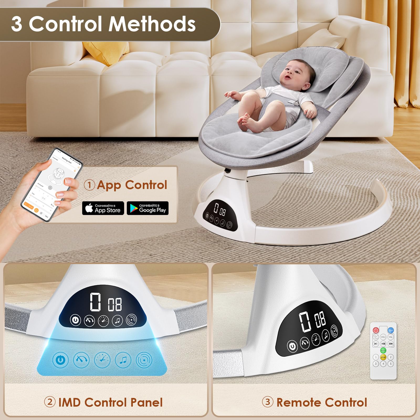 - 📱【Exclusive App and Bluetooth Player Function】- We are the only brand in the market with an exclusive App, in addition to using remote or touch screen control, our App can be simpler and smarter to control the electric baby swing, the distance and signal issues are less restrictive. Meanwhile, the Bluetooth play function allows you to play your baby's favorite music from your phone, providing your baby with peaceful or joyful moments.