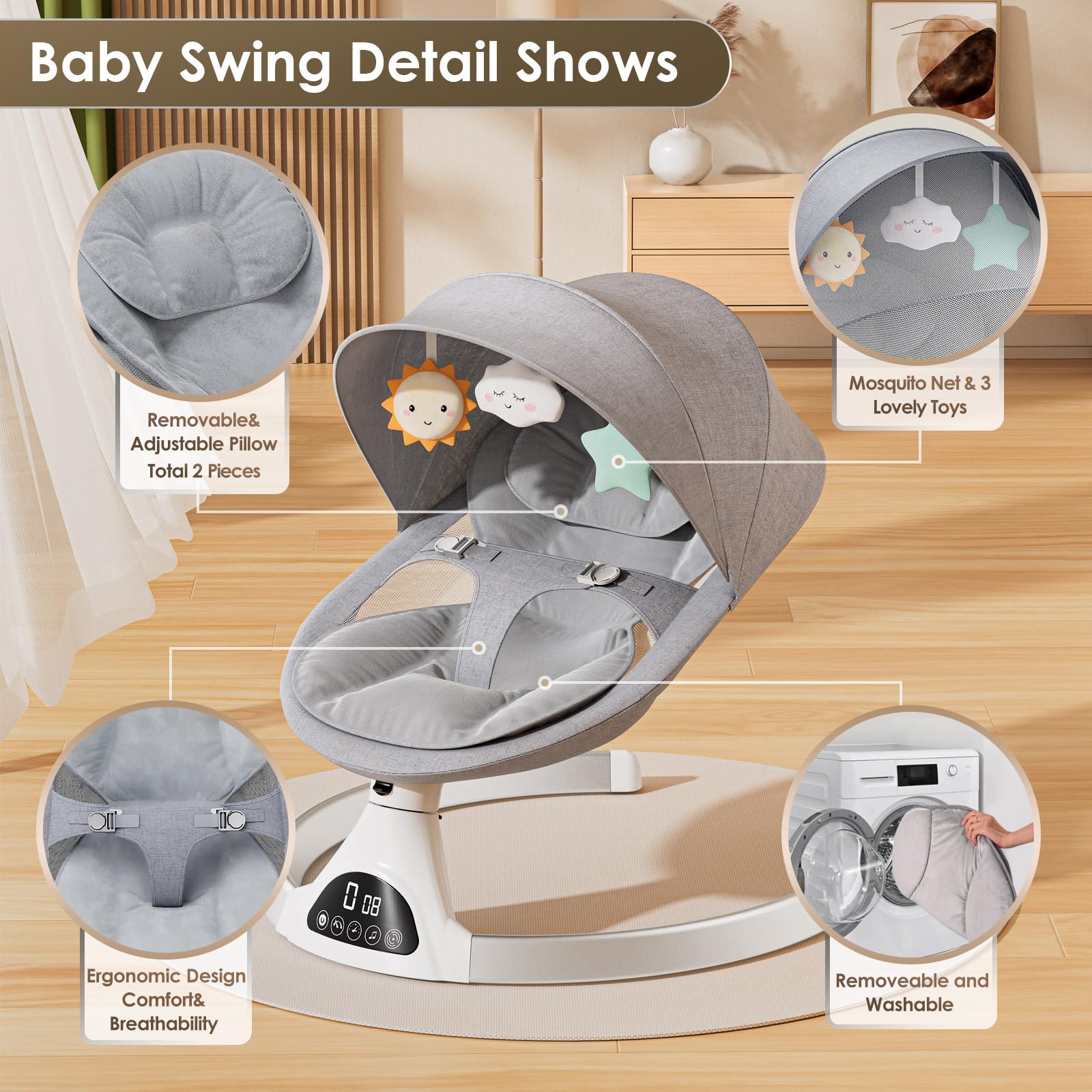 - 🤗【Included 3 Hang Ornaments & Back-up Pillow】-This portable baby swing includes a mosquito net and 3 hanging cuddly ornaments, protecting your baby and getting a better feeling. In addition, we give away an extra backup headrest for the baby's daily use(replacement and washable). 1.The product does not support battery power and only supports plug-in use. 2.The product only supports Apple and Android systems.