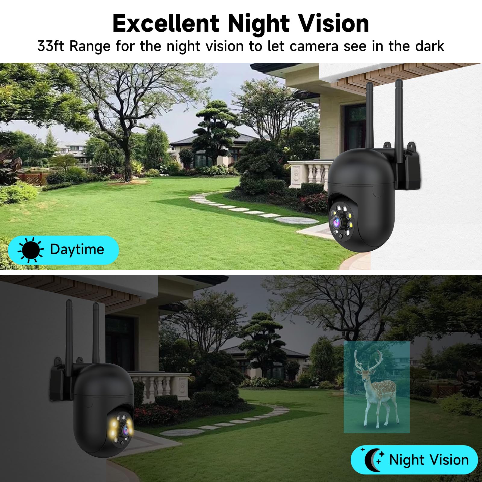 - Color Night Vision and Two-Way Audio: This home security camera is featured with infrared/color full/smart night vision function, which ensures clear, vivid pictures and stunning surveillance at night. Advanced IR night vision up to 33ft. Built-in microphone and speaker offers two-way audio and support communication with your family and pet when you are out.