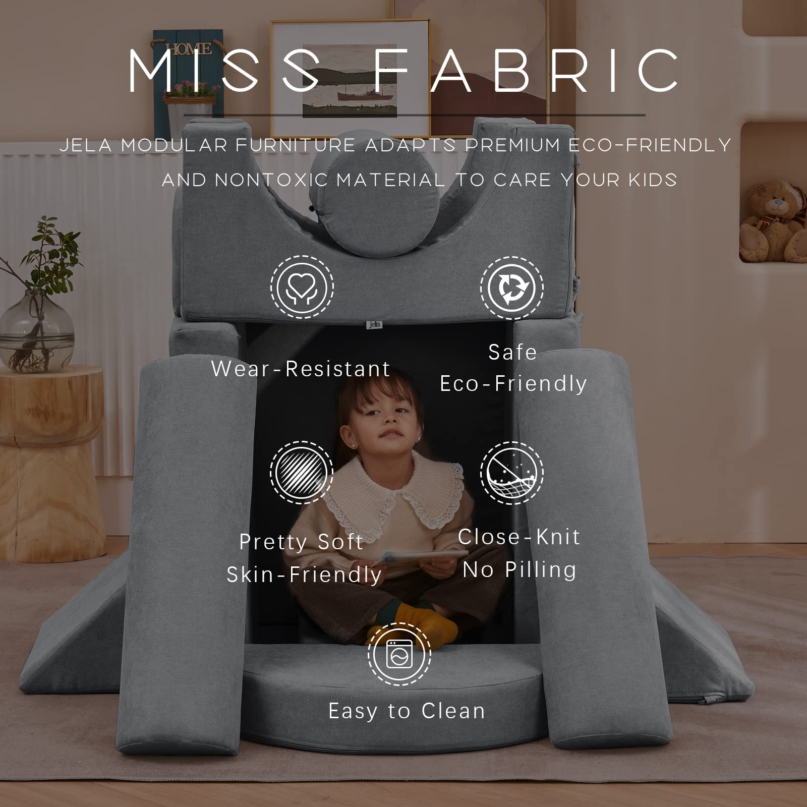 - Selected material Miss Fabric – Jela modular furniture adapts premium eco-friendly and nontoxic material to care your kids’ health with soft touch sense. The whole product has been passed CertiPUR-US which prohibits any CFCs use, or any harmful elements through the whole manufacturing. The whole product uses upscale miss fabric to make you feel unique and superb texture.