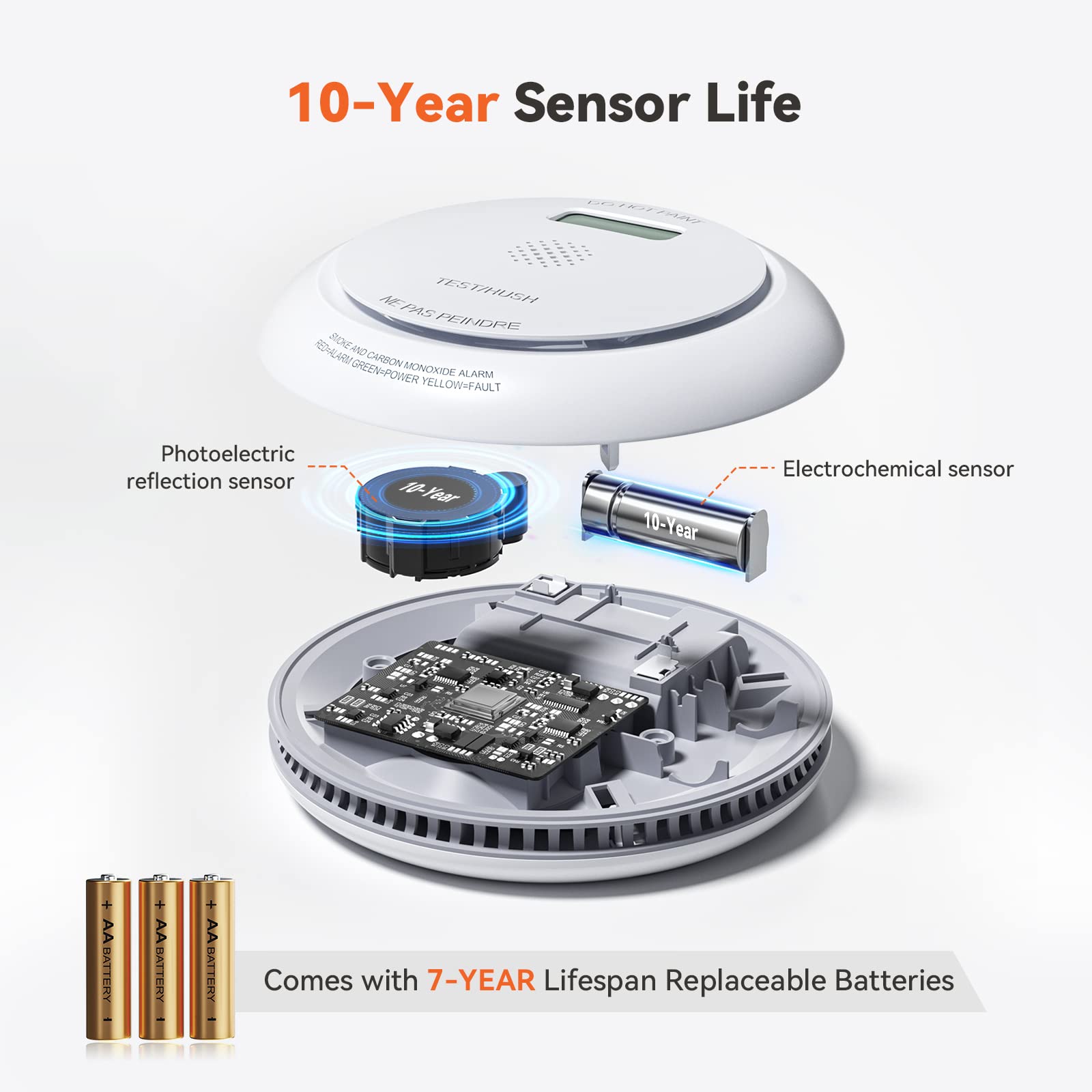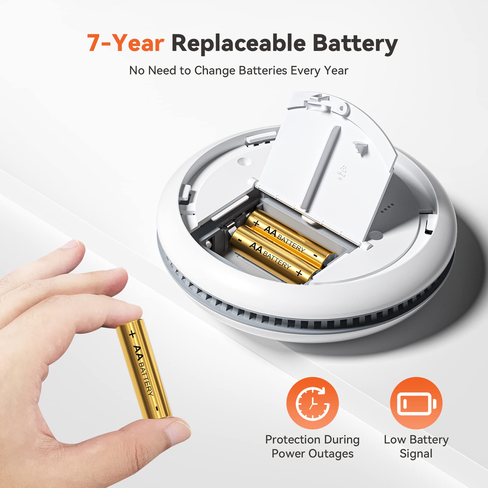 - [7-Year Replaceable Battery] The 10-Year lifespan fire and CO alarm is Powered by 3 AA batteries for easy installation, without requiring an electrician. The sustainable power of battery supplies for 7 years and features 3 reminder modes to let you know when they need replacing:chirp sound, indicator light, and LCD display.