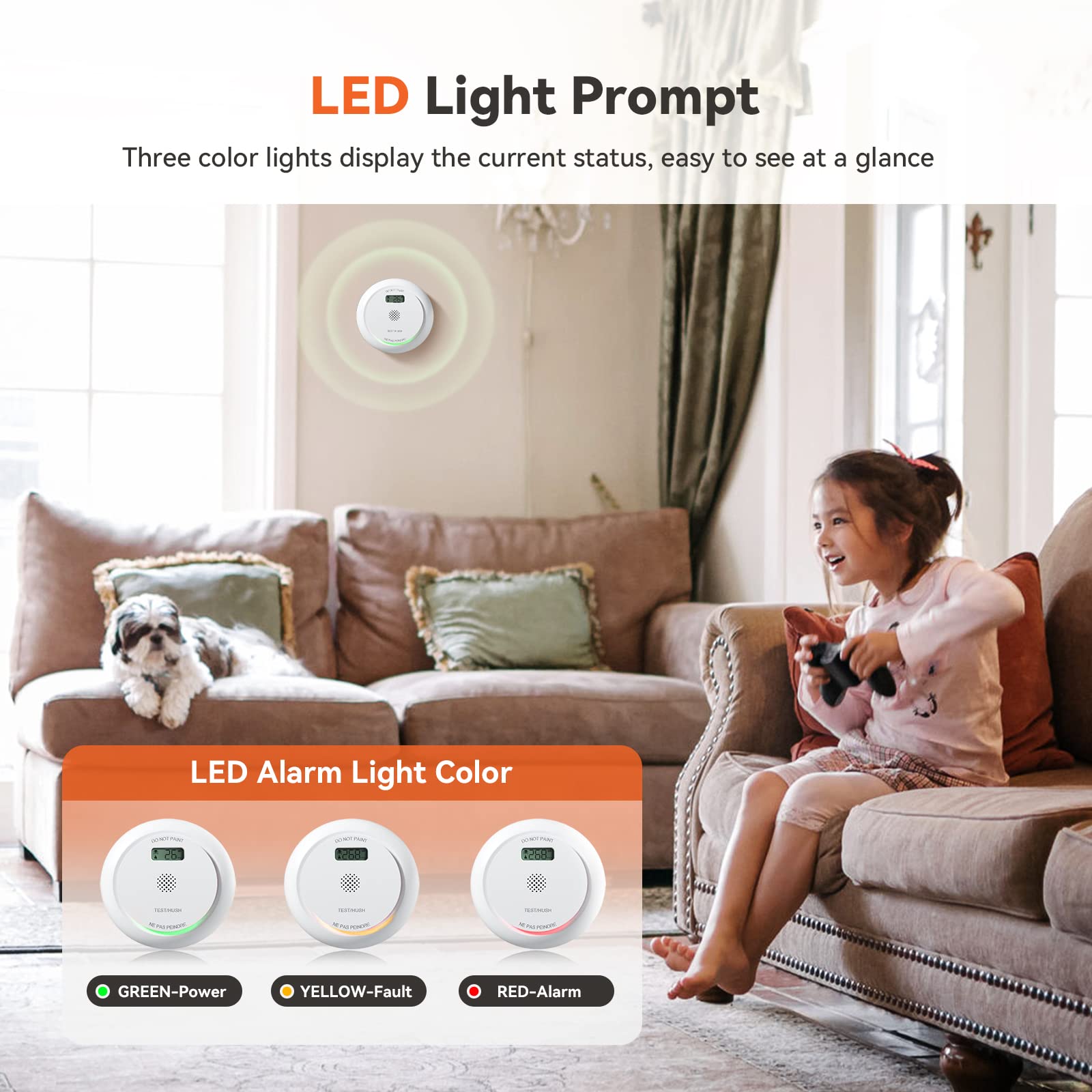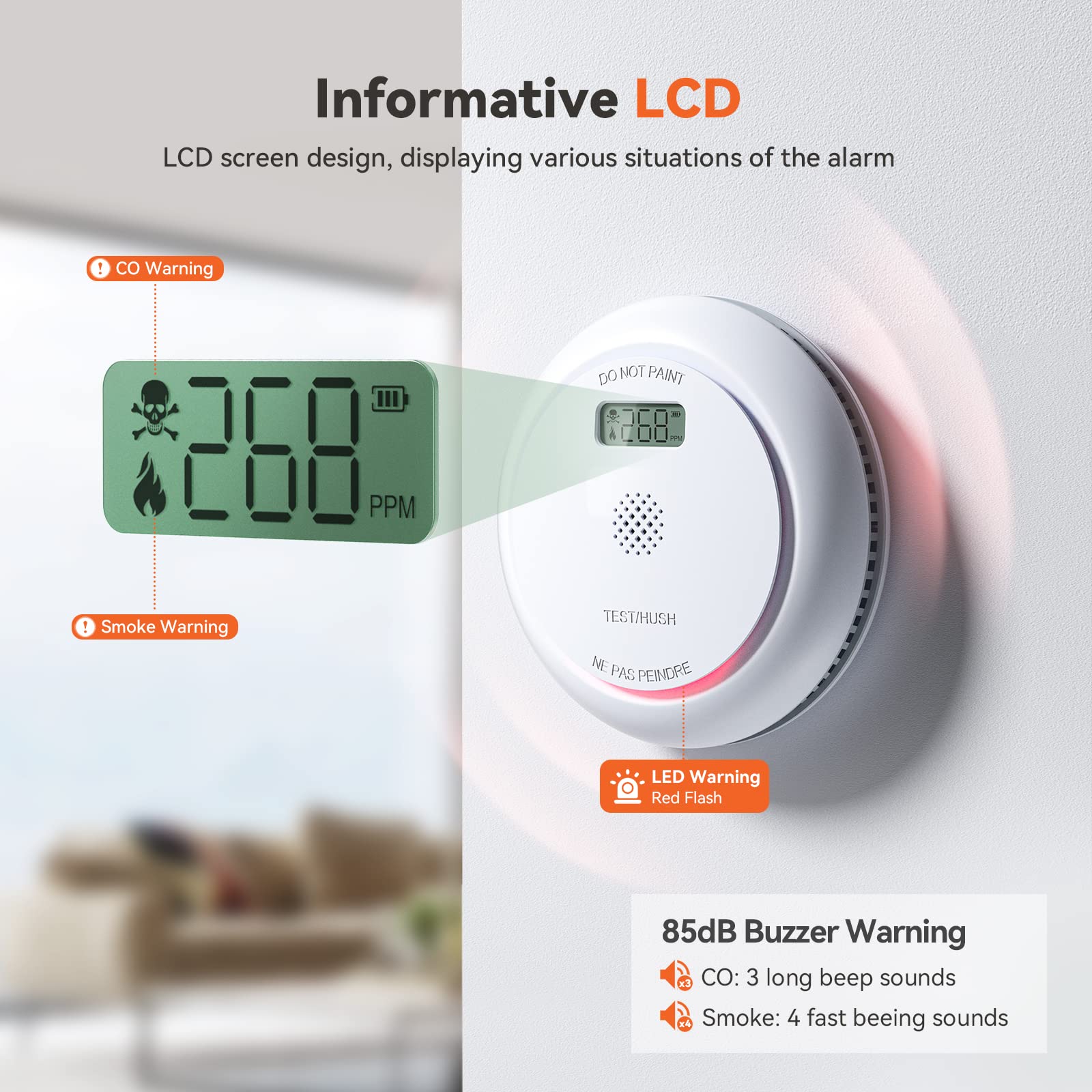 - [Alert You to Danger] Three alarm mode: 85dB buzzer, LCD and LED Warning. When a threat is detected, the smoke and carbon monoxide alarm sounds a loud 85dB siren that is designed to wake even the soundest of sleepers. At the same time as the sound alarm, the red light flashes and the LCD screen displays fire or CO icon.