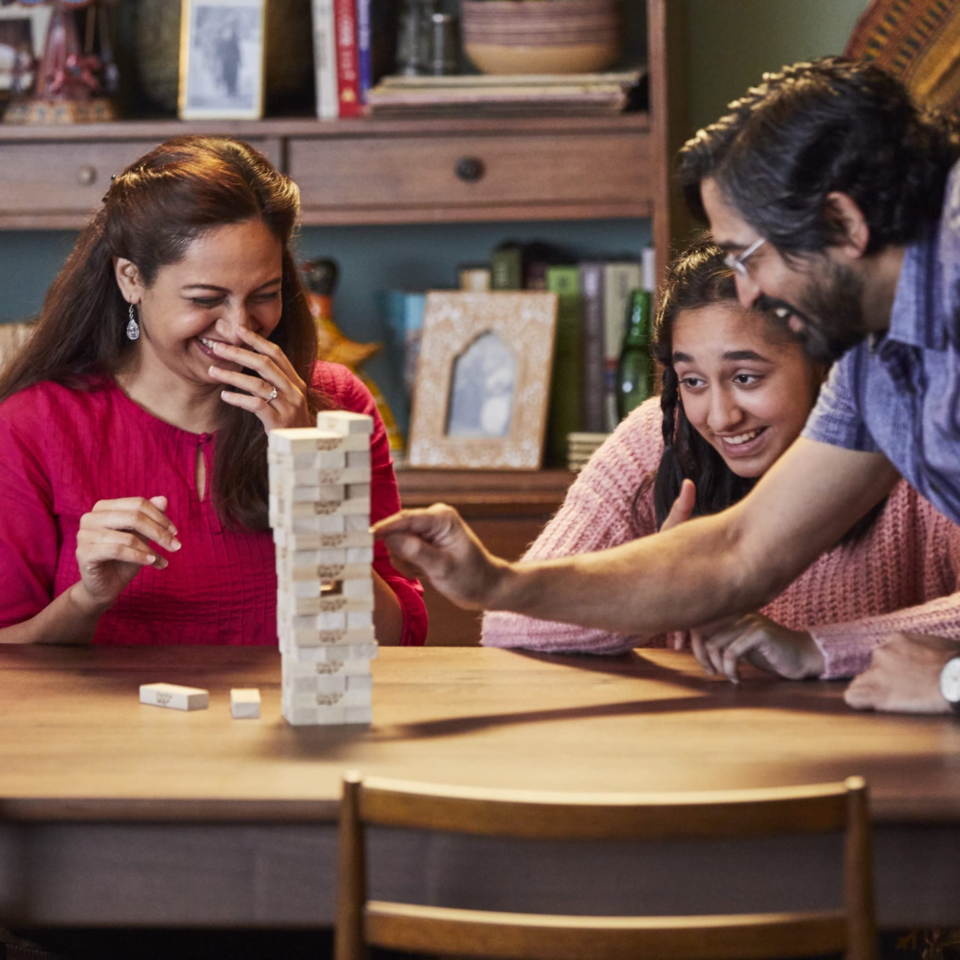 Want a game experience that combines skill, suspense, laughter, and maybe a little luck? Look for the Jenga game! It's an easy-to-play game that's fun for the whole family. Carefully pull a wood block out of the tower and place it on top. It's simple at first, but as more Jenga blocks get pulled, the tower becomes unsteady. Players will be on the edge of their seats trying to keep the tower from tumbling. Quick to set up, this Jenga game for can be played nearly anytime, anywhere. It comes with an easy-to-use stacking sleeve for storage, making it one of the best travel games! The Jenga game is one of the best family games for game night, and fun party games make excellent family gifts or gifts for kids. Jenga is a registered trademark of Pokonobe Associates. How Do You Jenga? Is a trademark owned by Pokonobe Associates Hasbro Gaming and all related trademarks and logos are trademarks of Hasbro, Inc.