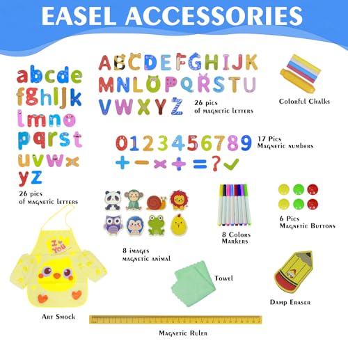 - 🎨CREATIVE ACCESSORIES: our art easel using pine wood and PP materials, sturdiness and durability. Come with multi accessories: apron, magnetic Nos., letters & animals., dust free chalk & markers, eraser and rule.