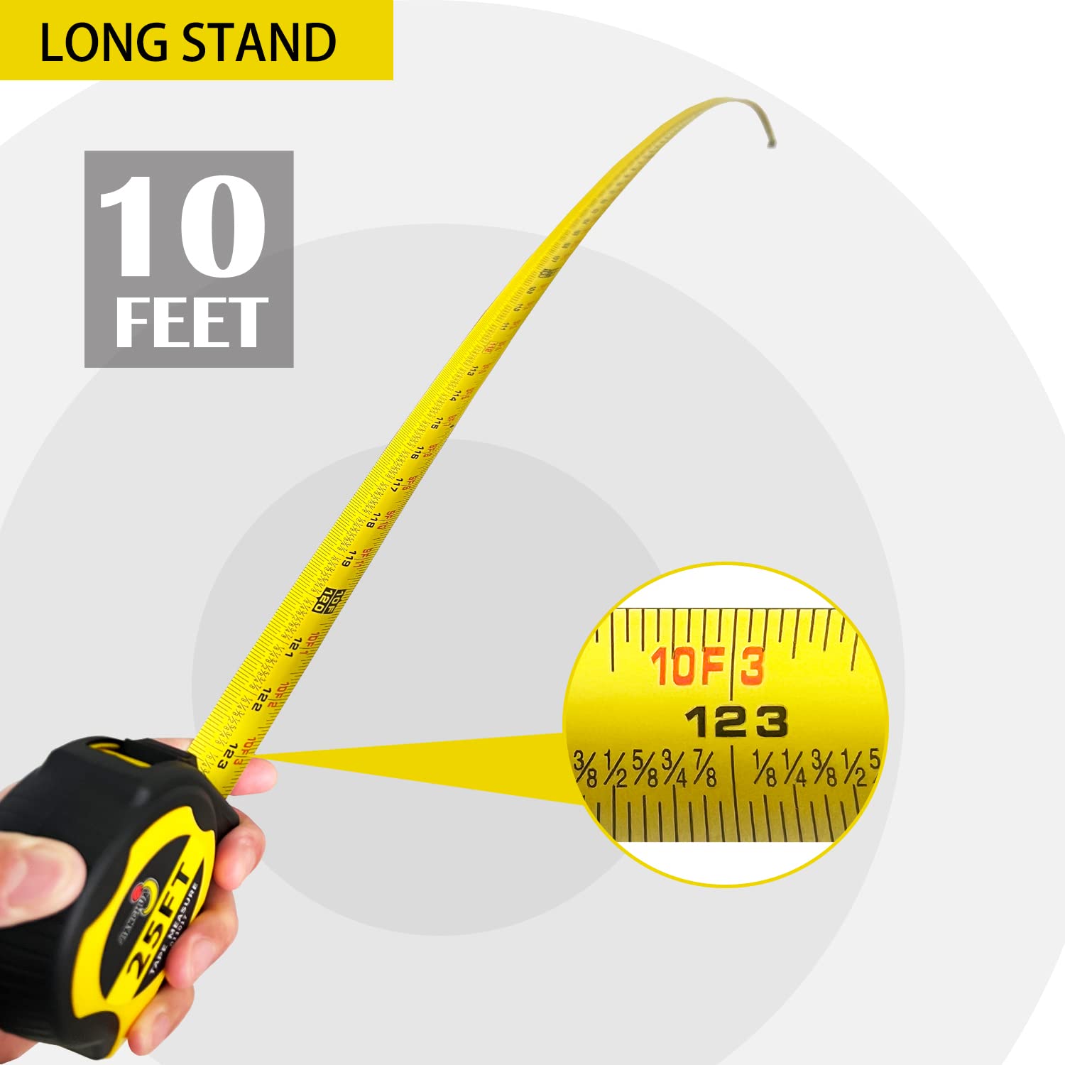 - 【Strong & Durable】The blade of this 25ft measuring tape is 1.1in width and 0.0047in thickness which is made of high quality thickened steel and coated with a wear-resistant coating, super durable to ensures it stiff enough to feed out 10ft easily without bending.