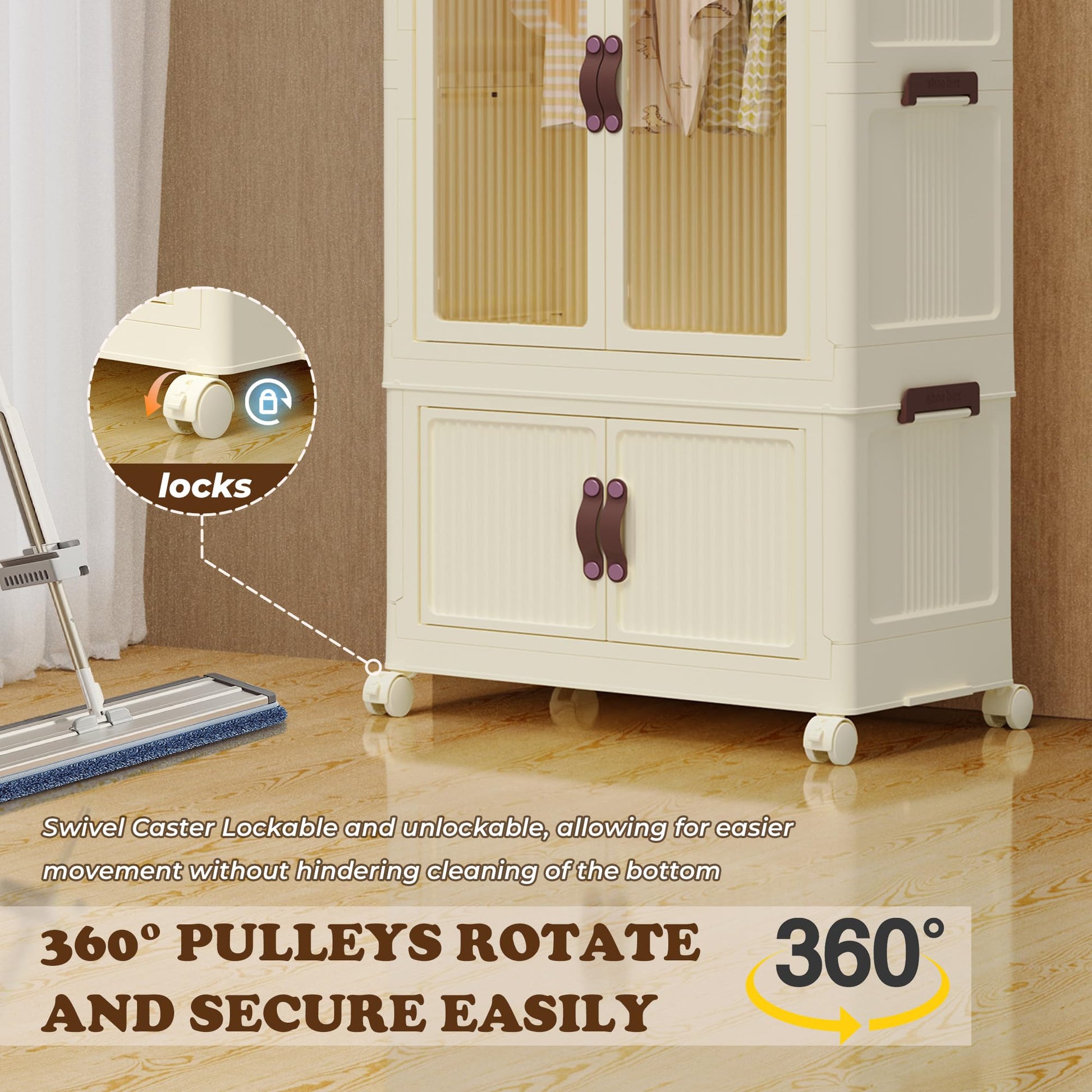 - đă360 Rotating Wheels LockableăOur armoire wardrobe closet features 4 piece 360 degree swivel wheels for seamless movement. Push down on the latch to secure the pulley, preventing the wardrobe from moving and ensuring safety. When cleaning, the pulleys can be unlocked upward, making it easy to move the portable wardrobe closet from room to room