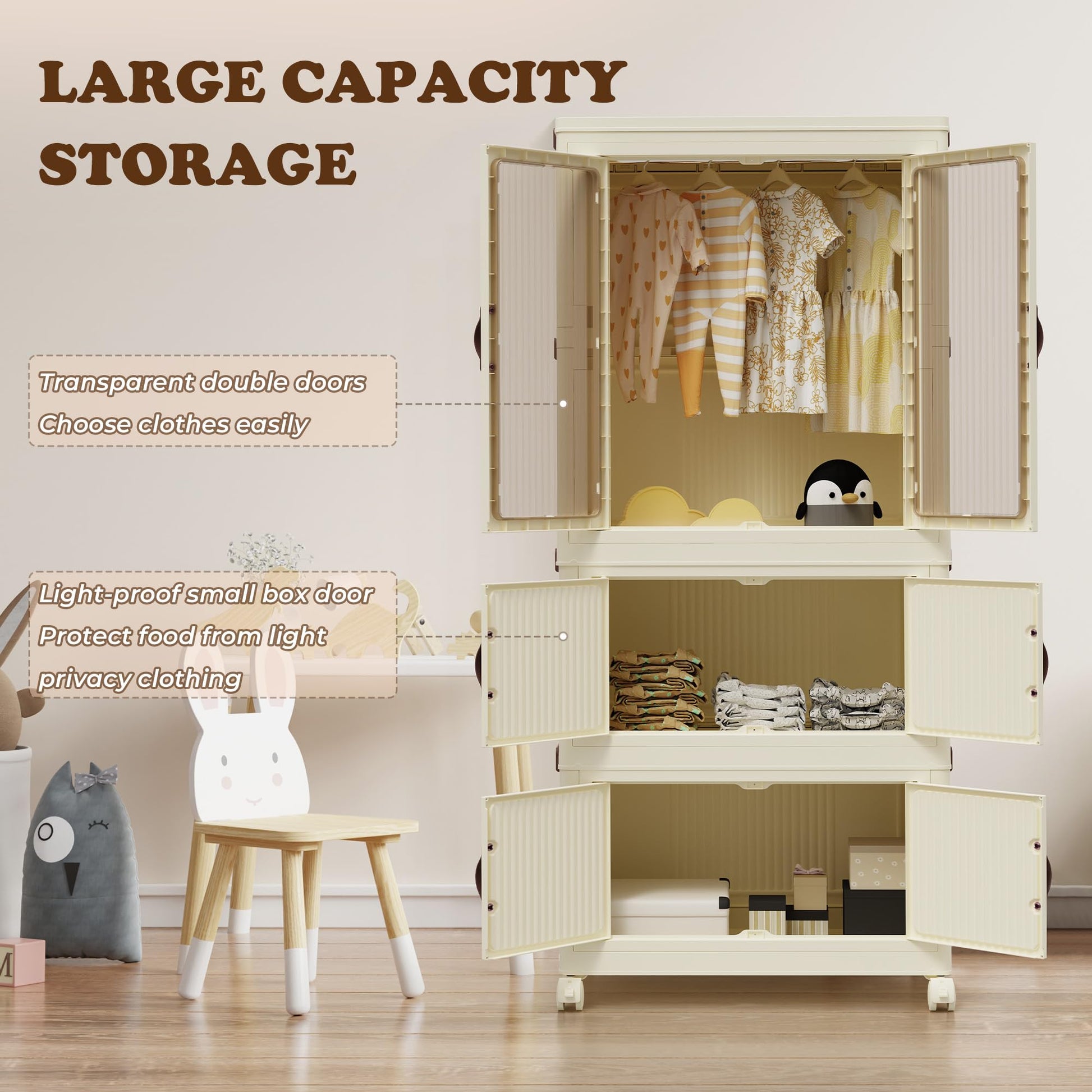 ăExquisite DetailsăTransparent visible double doors,comfortable handle and foldable wardrobe with wheels design make the portable kids wardrobe closet easier to move and clean in the bedroom. The box is able to be opened in two ways. You can open the lid at the top of it, or you can open it through the front door. The shading area can be used to store food and privacy clothing.