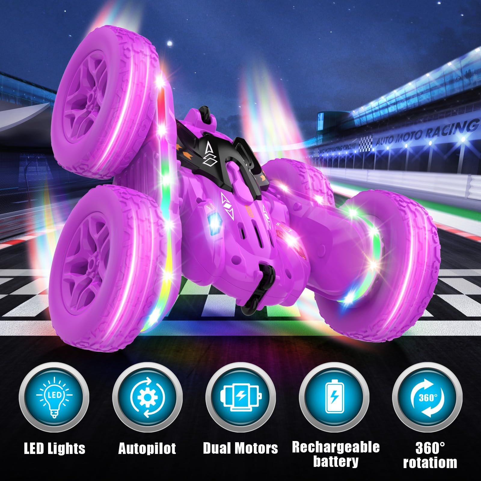 Jimdella Remote Control Car,RC Cars with sides light strip and Headlights,Double Sided 360 Flips Rotating RC Stunt Car,2.4Ghz All Terrain Toys for Ages 4-6 Kid Toy for Boys Girls Birthday Gift(Purple)