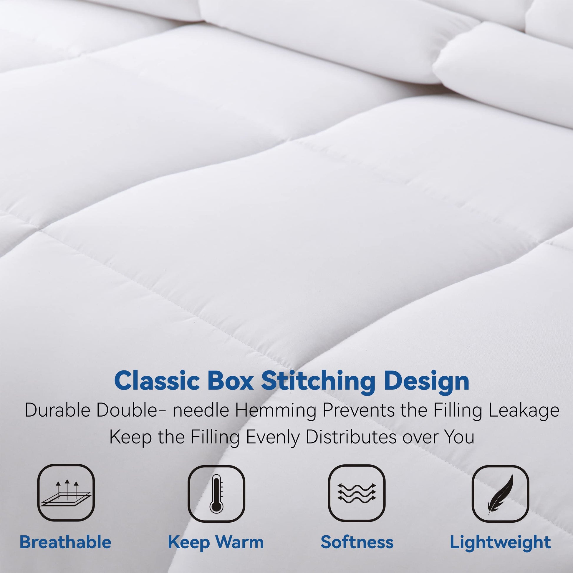 - ✦Premium Craftsmanship -- Our down alternative comforters feature elegant style box stitching and double-needle hemming which ensures an even distribution of warmth that no filling will bunch up , shift around or leak out. The 8 corner tabs make it extremely easy to put on duvet cover and secures the comforter in place. Exquisite hemming, durable and long lasting, perfect for year round use.
