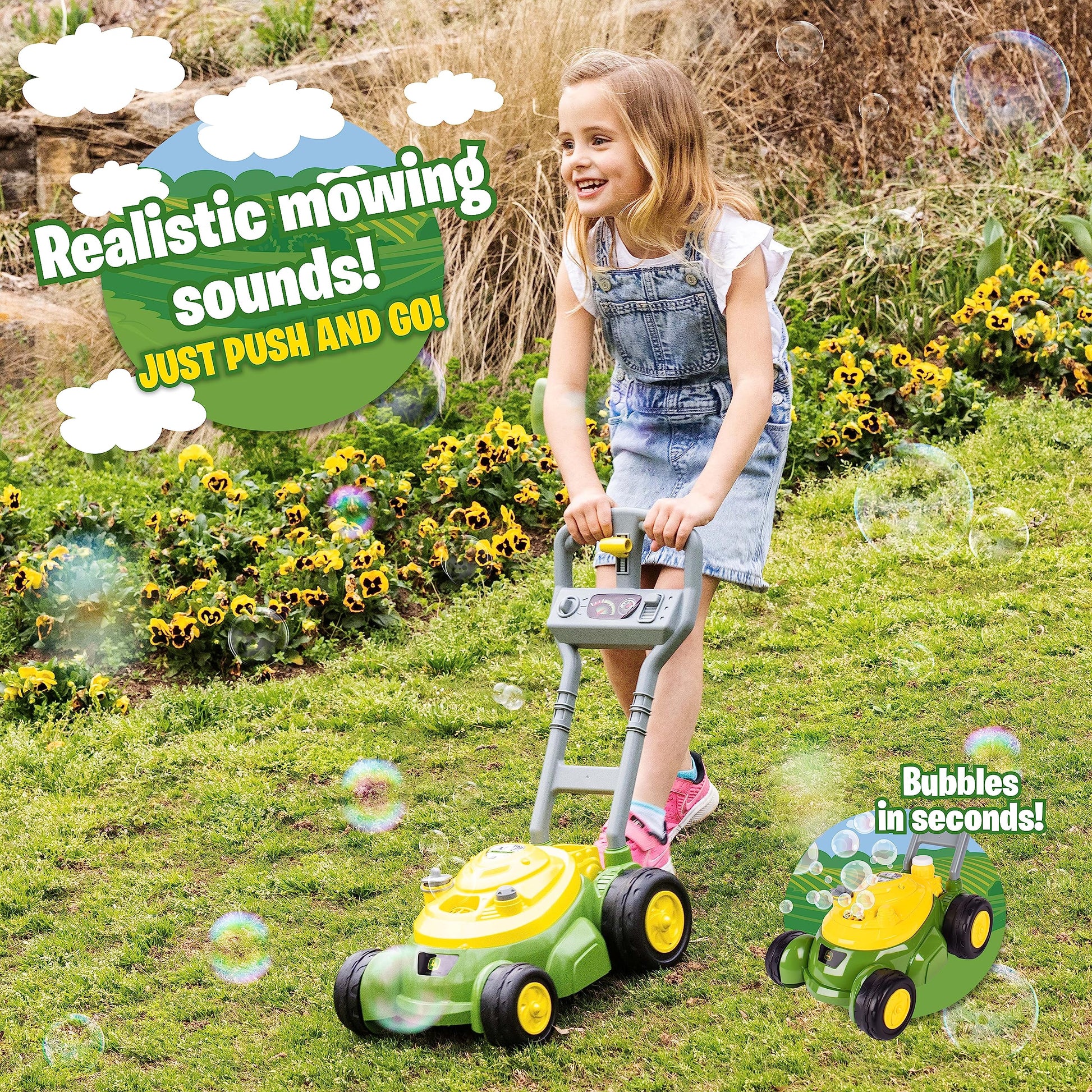 Details: Turn your yard into a world of bubble fun with the John Deere Bubble-N-Go Mower. This toy is designed for kids ages 3 and up who are eager to imitate their favorite adult and join in the yard work fun. Inspired by real life John Deere mowers, this playful toy has true-to-life features and mechanical sounds bring imagination to life. Each push creates a trail of bubbles that make yard work instantly fun! Simply fill with the included bubble solution and push and let the bubbles fly. As they play, kids will be learning and developing responsibility, motor skills and creativity all through active, pretend play. No batteries required when ‘mowing’ the lawn - it's all kid power. Push the bubbles into action and create countless memories!