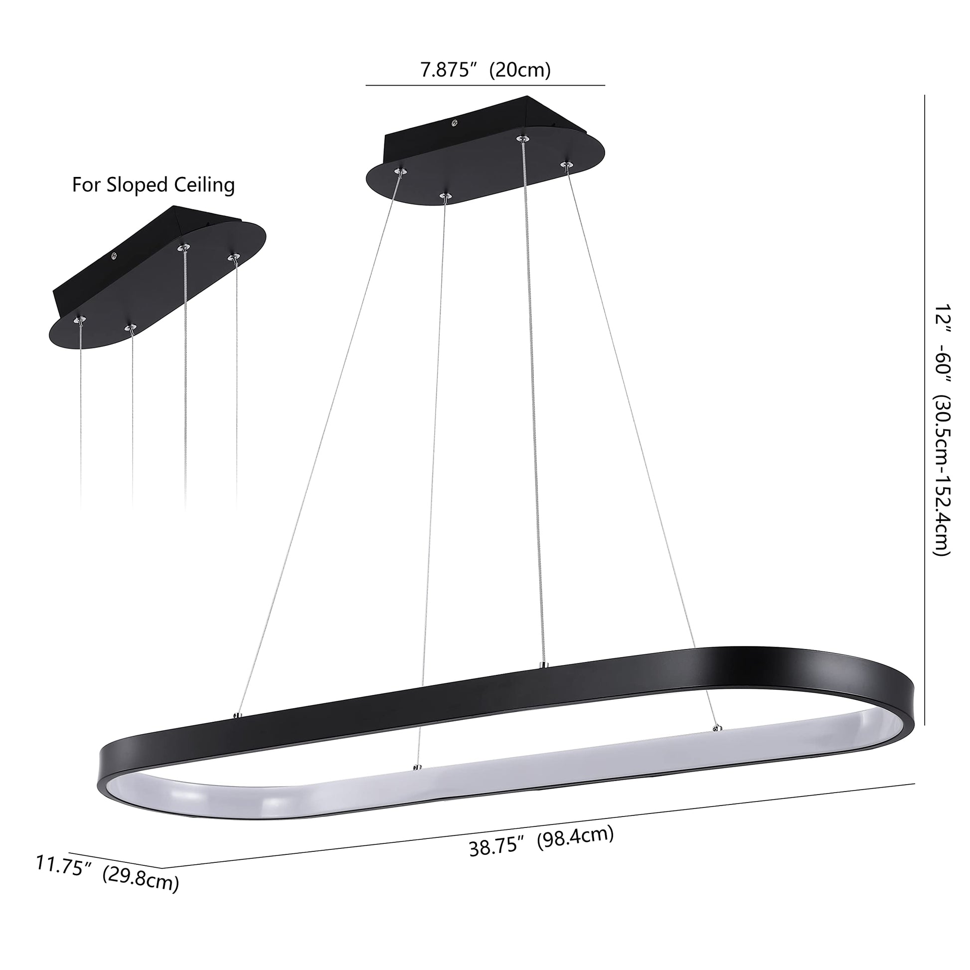 Details: Add a piece of modern sculpture to your home with our minimalist pendant light's unique design. A long oval ring suspended from cables provides bright, warm light via integrated LED technology. This contemporary chandelier is the perfect update for your modern dining room, kitchen, or office.