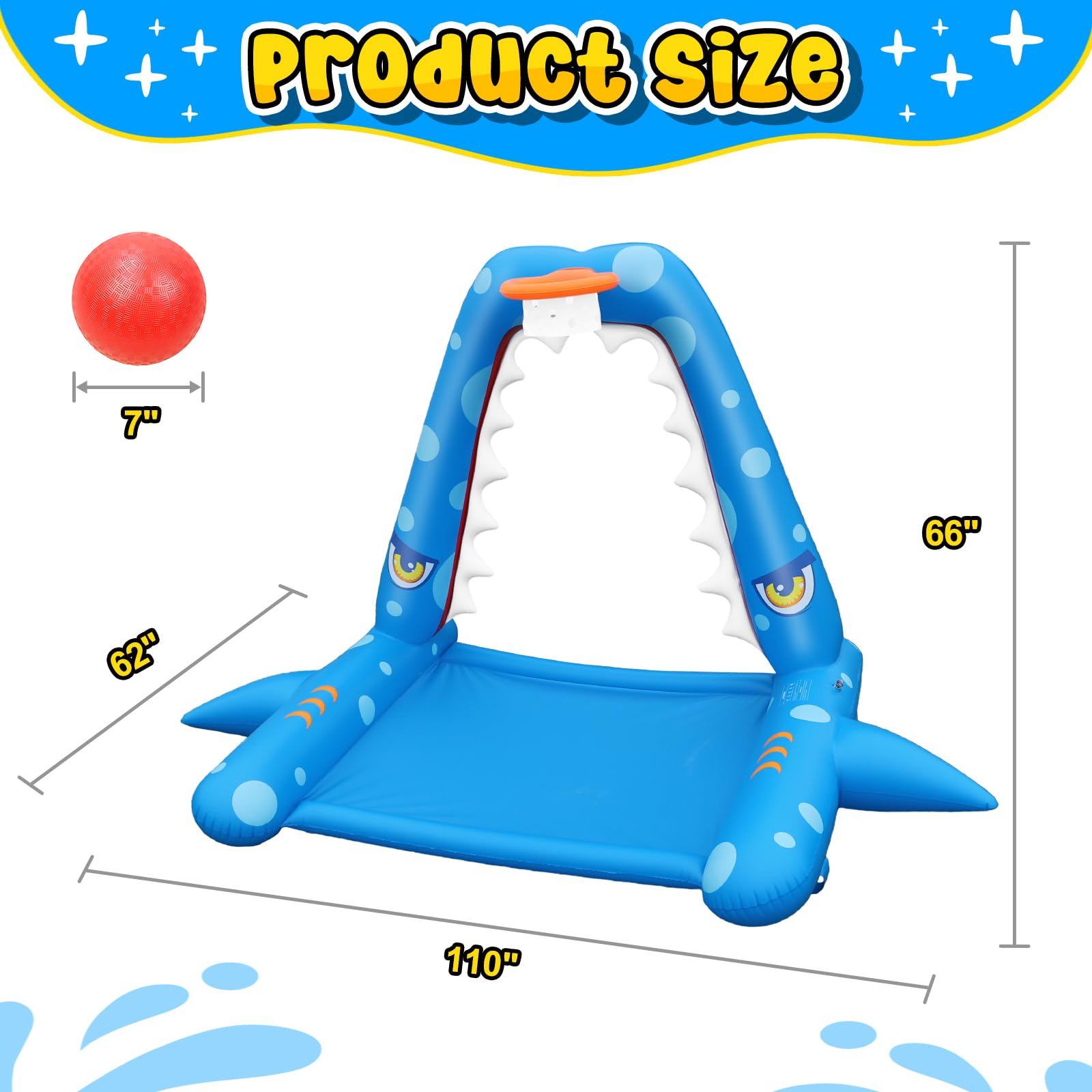 - Inflatable Sprinkler For Kids: Unique shark water sprinkler with a basketball hoop, the combination of the two games is refreshing and brings endless fun that kids can enjoy playing basketball and water games this summer. The outdoor water toys will be the best gift to make your kids' summer holiday spectacular.
