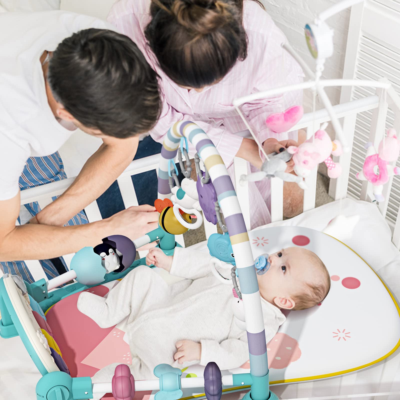 Jovow Baby Gym with Kick and Play Piano,Baby Play Mat Tummy Time Baby Activity Gym Mat with 5 Infant Learning Sensory for Baby, Music and Lights Boy or Girl Gifts for Newborn (Green)