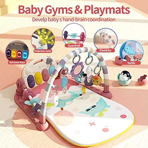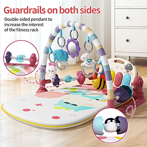 Jovow Baby Gym with Kick and Play Piano,Baby Play Mat Tummy Time Baby Activity Gym Mat with 5 Infant Learning Sensory for Baby, Music and Lights Boy or Girl Gifts for Newborn(Pink)