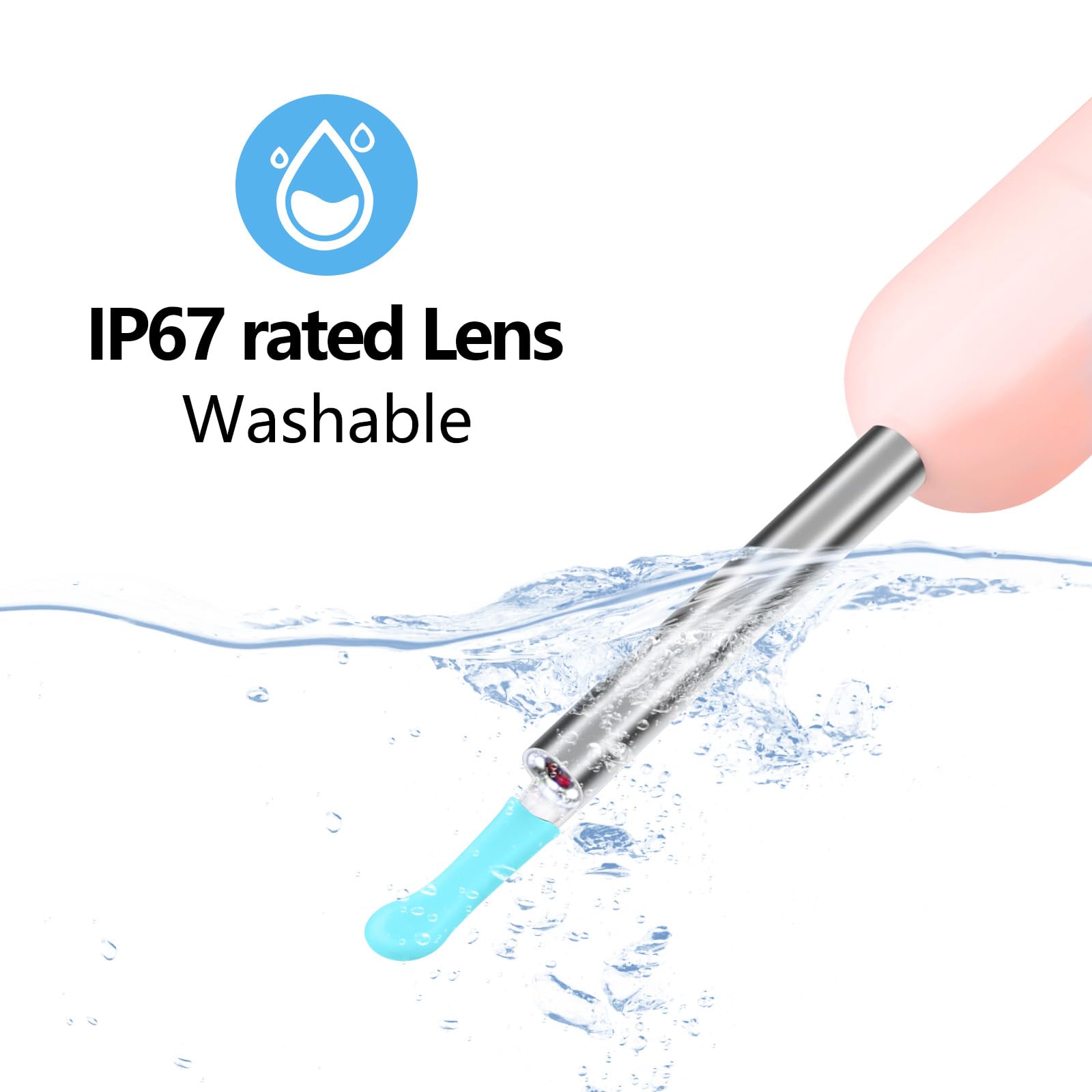 - IP67 Waterproof Otoscope: the camera len can be washed with water or wiped with cotton swab before and after use, please do not put the whole otoscope in water (The charging port is not waterproof).It is not advisable to clean the lens with alcohol or alcohol-based cleaners too.