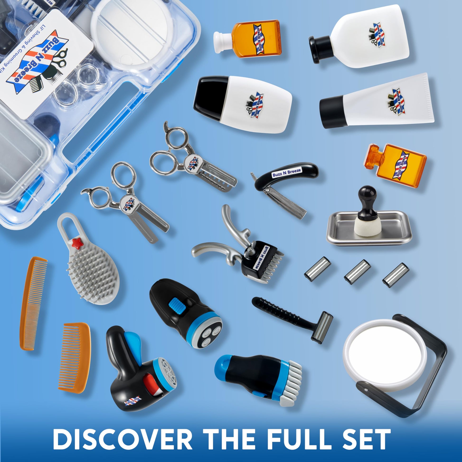 - COMPREHENSIVE SET: Our pretend play set includes 23 Pcs barber shop pretend play kit for boys which includes a Shaver, Hair Trimmers, Scissors, Razors, a Hairdryer, a Mirror, a Comb, Bottles, a Cleaning Brush, and other boy salon styling accessories for your kid.