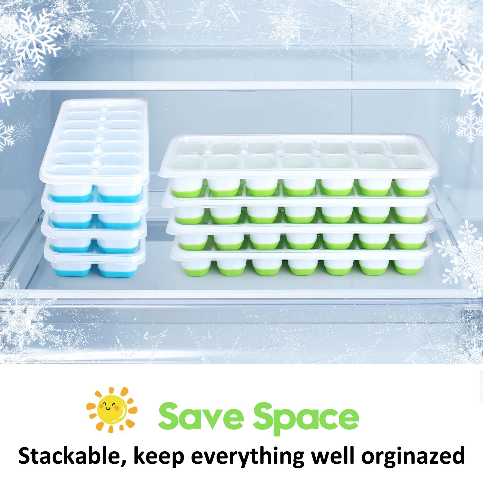 - Stackable & Removable Lid: These covered ice cube trays come with removable lids, which allow you to stack them in the freezer and save tons of space. The lids also keep the freezer smell and taste out of the water, so you can enjoy clear and clean ice cubes.